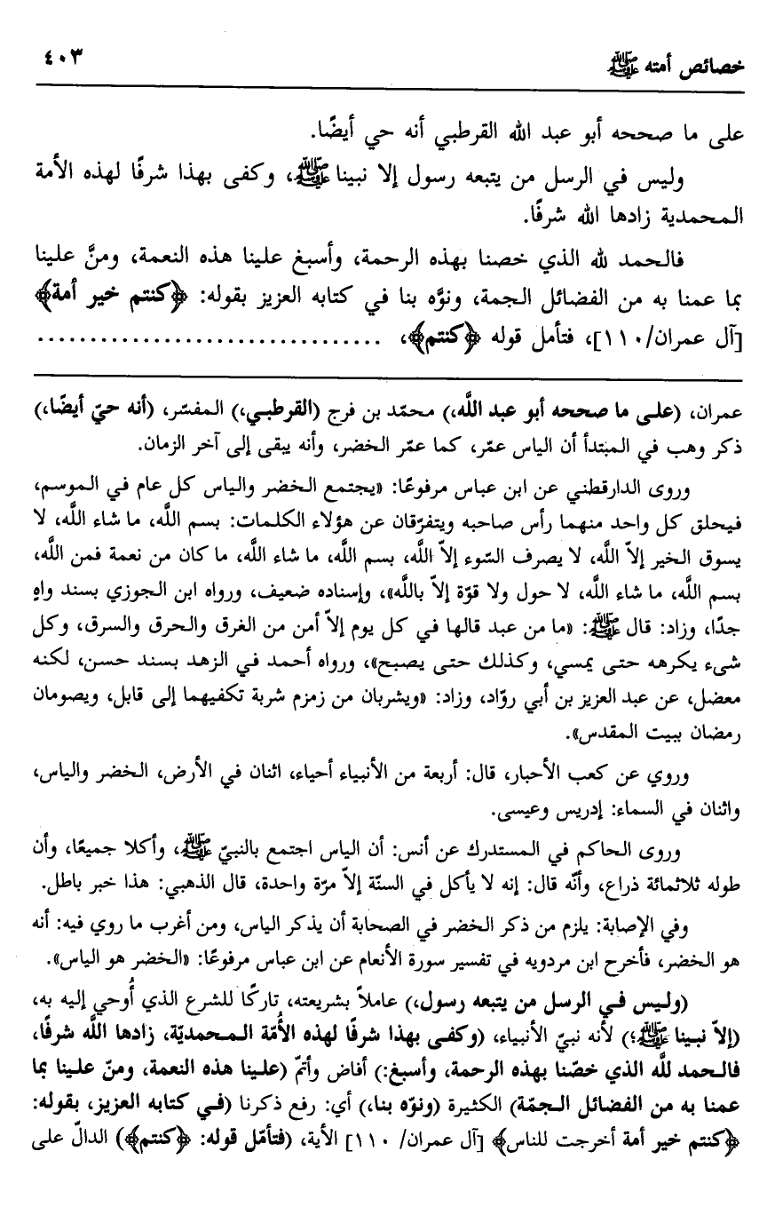 عمران، "على ما صححه أبو عبد الله" محمد بن فرج "القرطبي" المفسر، "أنه حي أيضًا" ذكر وهب في المبتدأ أن إلياس عمر، كما عمر الخضر، وأنه يبقى إلى آخر الزمان.