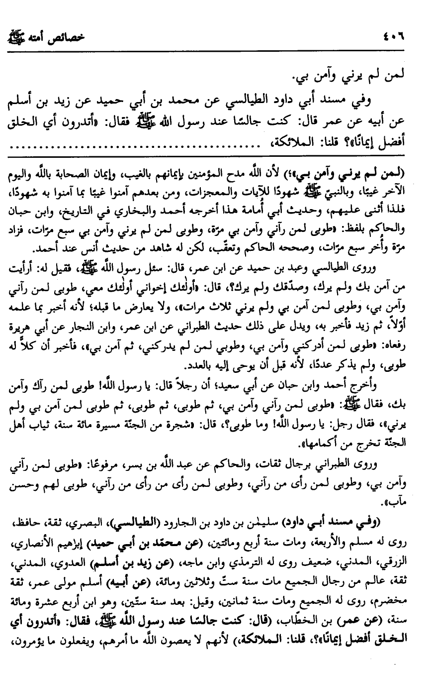 وروى الطيالسي وعبد بن حميد عن ابن عمر، قال: سئل رسول الله صلى الله عليه وسلم، فقيل له: أرأيت من آمن بك ولم يرك، وصدقك ولم يرك؟ قال: "أولئك إخواني أولئك معي، طوبى لمن رآني وآمن بي، وطوبى لمن آمن بي ولم يرني ثلاث مرات"، ولا يعارض ما قبله؛ لأنه أخبر بما علمه أولا، ثم زيد فأخبر به، ويدل على ذلك حديث الطبراني عن ابن عمر، وابن النجار عن أبي هريرة رفعاه: "طوبى لمن أدركني وآمن بي، وطوبى لمن لم يدركني، ثم آمن بي"، فأخبر أن كلا له طوبى، ولم يذكر عددًا، لأنه قبل أن يوحى إليه بالعدد.