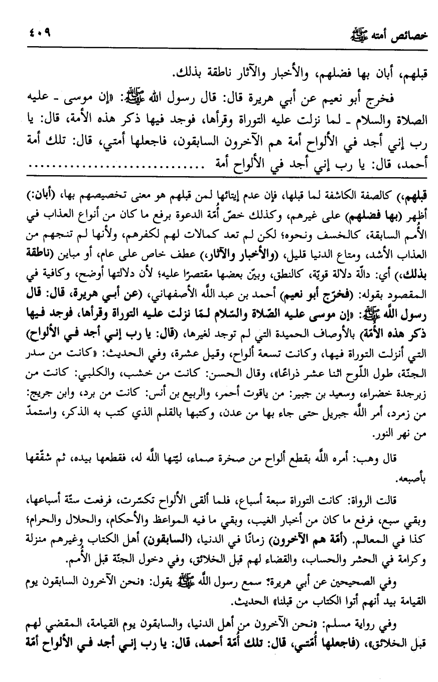 فخرج أبو نعيم عن أبي هريرة قال: قال رسول الله صلى الله عليه وسلم: "إن موسى -عليه الصلاة والسلام- لما نزلت عليه التوراة وقرأها، فوجد فيها ذكر هذه الأمة، قال: يا رب إني أجد في الألواح أمة هم الآخرون السابقون، فاجعلها أمتي، قال: تلك أمة أحمد، قال: يا رب إني أجد في الألواح أمة