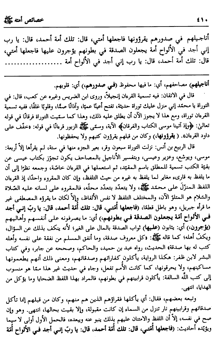 أناجيلهم في صدورهم يقرءونها فاجعلها أمتي، قال: تلك أمة أحمد، قال: يا رب إني أجد في الألواح أمة يجعلون الصدقة في بطونهم يؤجرون عليها فاجعلها أمتي، قال: تلك أمة أحمد، قال: يا رب إني أجد في الألواح أمة