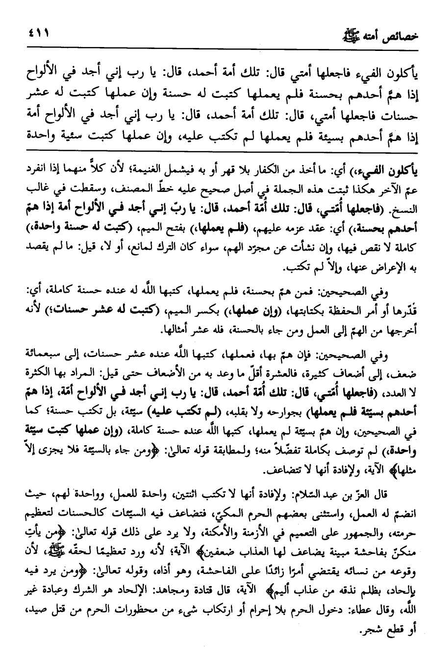وفي الصحيحين: فإن هم بها، فعملها، كتبها الله عنده عشر حسنات، إلى سبعمائة ضعف، إلى أضعاف كثيرة، فالعشرة أقل ما وعد به من الأضعاف حتى قيل: المراد بها الكثرة لا العدد، "فاجعلها أمتي، قال: تلك أمة أحمد: قال: يا رب إني أجد في الألواح أمة، إذا هم أحدهم بسيئة فلم يعملها" بجوارحه ولا بقلبه، "لم تكتب عليه" سيئة، بل تكتب حسنة؛ كما في الصحيحين، وإن هم بسيئة لم يعملها، كتبها الله عنده حسنة كاملة، "وإن عملها كتبت سيئة واحدة" لم توصف بكاملة تفضلا منه؛ ولمطابقة قوله تعالى: {وَمَنْ جَاءَ بِالسَّيِّئَةِ فَلَا يُجْزَى إِلَّا مِثْلَهَا} الآية، ولإفادة أنها لا تتضاعف.