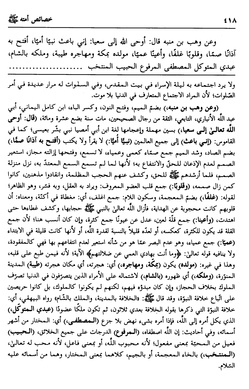 "وعن وهب بن منبه" بضم الميم، وفتح النون، وكسر الباء، ابن كامل اليماني، أبي عبد الله الأنباري، التابعي، الثقة من رجال الصحيحين، مات سنة بضع عشرة ومائة، "قال: أوحى الله تعالى إلى سعيا" بسين مهملة وإعجامها لغة ابن أبي أمصيا نبي بشر بعيسى؛ كما في القاموس: "إني باعث" إلى جميع العالمين "نبيًا أميًا" لا يقرأ ولا يكتب "أفتح به آذانًا صمًا" بضم الصاد، وشد الميم جمع صماء كعمى وعمياء، لا تسمع، وفتحها إزالته مجاز، استعير الصمم لعدم الإذعان للحق والانتفاع به؛ لأنها لما لم تسمع السمع المعتد به، نزل منزلة الصمم، فلما أرشدهم صلى الله عليه وسلم للحق، وكشف عنهم الحجب المظلمة، وانقادوا مذعنين، كانوا كمن زال صممه، "وقلوبًا" جمع قلب العضو المعروف: ويراد به العقل، وبه فسر، وهو الظاهر؛ لقوله: "غلفًا" بضم المعجمة، وسكون اللام: جمع أغلف، أي: مغطاة في أكنة، ومعناه: أن قلوبهم كانت محجوبة عن الهداية، فأزال الله تعالى بالنبي صلى الله عليه وسلم حجابها، وكشف غطاءها حتى اهتدت، "وأعينا" جمع قلة لعين، عدل عن عيونًا جمع كثرة، وإن كان أنسب هنا؛ لأن جمع القلة قد يكون للكثرة، كعكسه، أو لعده قليلا بالنسبة لقدرة الله، أو لأنها كانت قليلة في الابتداء "عميًا" جمع عمياء، وهو عدم البصر عما هو من شأنه استعير لعدم انتفاعهم بها فهي كالمفقودة، ولا ينافيه قوله تعالى: {وَمَا أَنْتَ بِهَادِي الْعُمْيِ عَنْ ضَلَالَتِهِمْ} الآية؛ لأنه فيمن طبع على قلبه، وهذا في غيره: "مولده" يكون "بمكة، ومهاجره" أي: هجرته، أي مكان هجرته "طيبة" المدينة المنورة، "وملكه"، أي ظهوره "بالشام" لاشتماله على الأمراء الذين يتصرفون في الدنيا تصرف الملوك بخلاف الحجاز، وإن كان مبدؤه فيهم، لكنهم لم يكونوا كالملوك، بل كانوا حريصين على اتباع خلافة النبوة، وقد قال صلى الله عليه وسلم: "الخلافة بالمدينة، والملك بالشام" رواه البيهقي، أي: خلافة النبوة التي ذكرها بقوله الخلافة بعدي ثلاثون، ثم تكون ملكًا عضودًا "عبدي المتوكل" الذي يكل أمره إلى الله، فإذا أمره بشيء نهض بلا جزع "المصطفى" أي: المختار من أشهر أسمائه، وفي أحاديث: إن الله اصطفاه، " المرفوع" الدرجات على جميع الخلائق، "الحبيب" فعيل من المحبة بمعنى مفعول؛ لأنه محبوب الله، أو بمعنى فاعل، لأنه محب له تعالى، "المنتخب" بالخاء المعجمة، أو بالجيم، كلاهما بمعنى المختار، وهما من أسمائه عليه السلام.