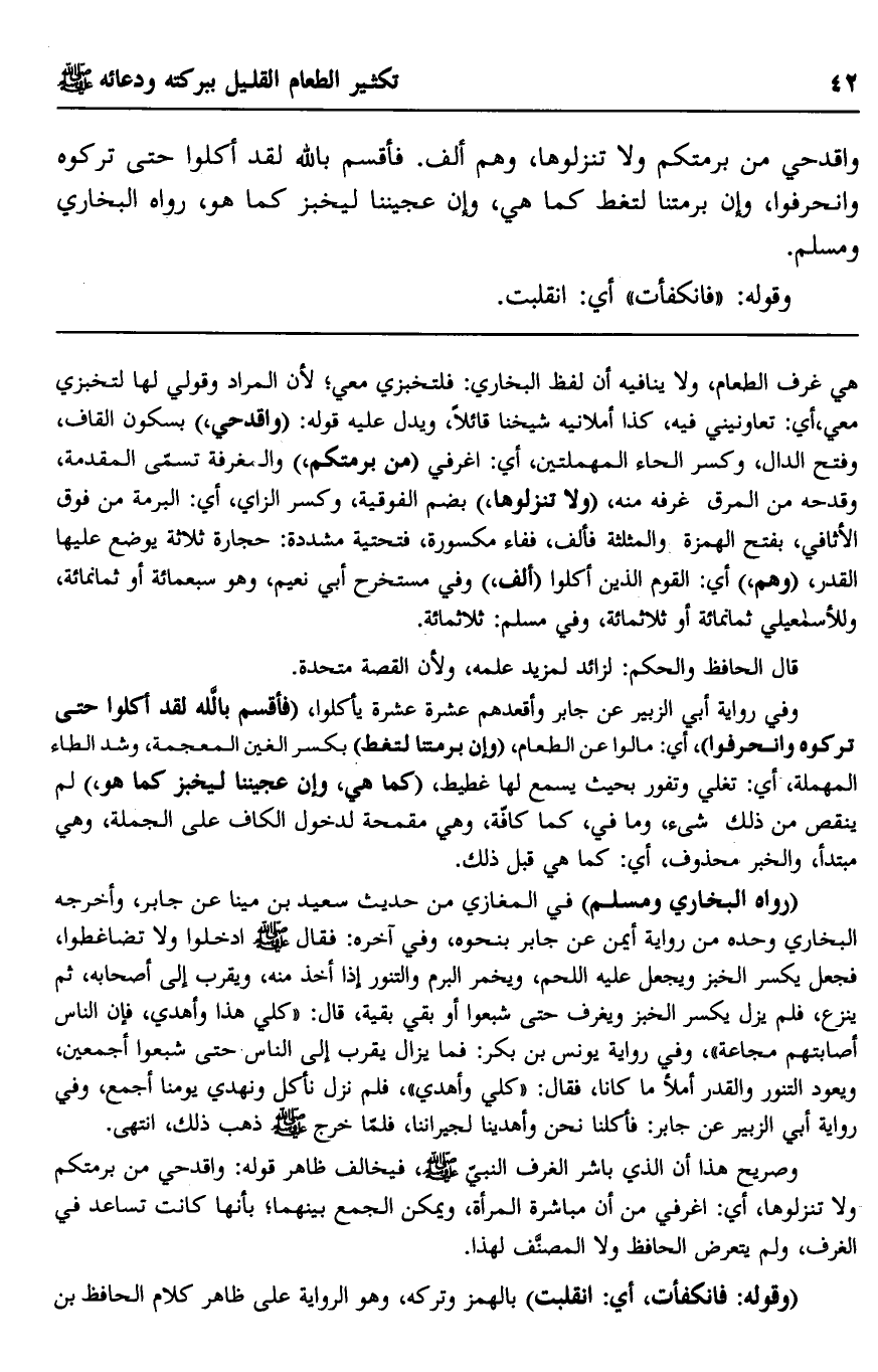 واقدحي من برمتكم ولا تنزلوها". وهم ألف. فأقسم بالله لقد أكلوا حتى تركوه وانحرفوا، وإن برمتنا لتغط كما هي، وإن عجيننا ليخبز كما هو، رواه البخاري ومسلم.
