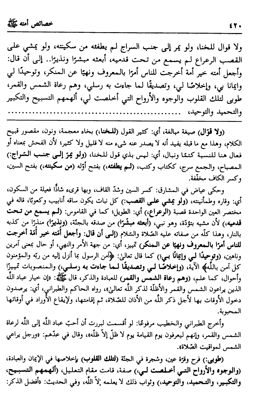 ولا قوال للخنا، ولو يمر إلى جنب السراج لم يطفئه من سكينته، ولو يمشي على القصب الرعراع لم يسمع من تحت قدميه، أبعثه مبشرًا ونذيرًا إلى أن قال: وأجعل أمته خير أمة أخرجت للناس أمرًا بالمعروف ونهيًا عن المنكر، وتوحيدًا لي وإيمانًا بي، وإخلاصًا لي، وتصديقًا لما جاءت به رسلي، وهم رعاة الشمس والقمر، طوبى لتلك القلوب والوجوه والأرواح التي أخلصت لي، ألهمهم التسبيح والتكبير والتحميد والتوحيد،