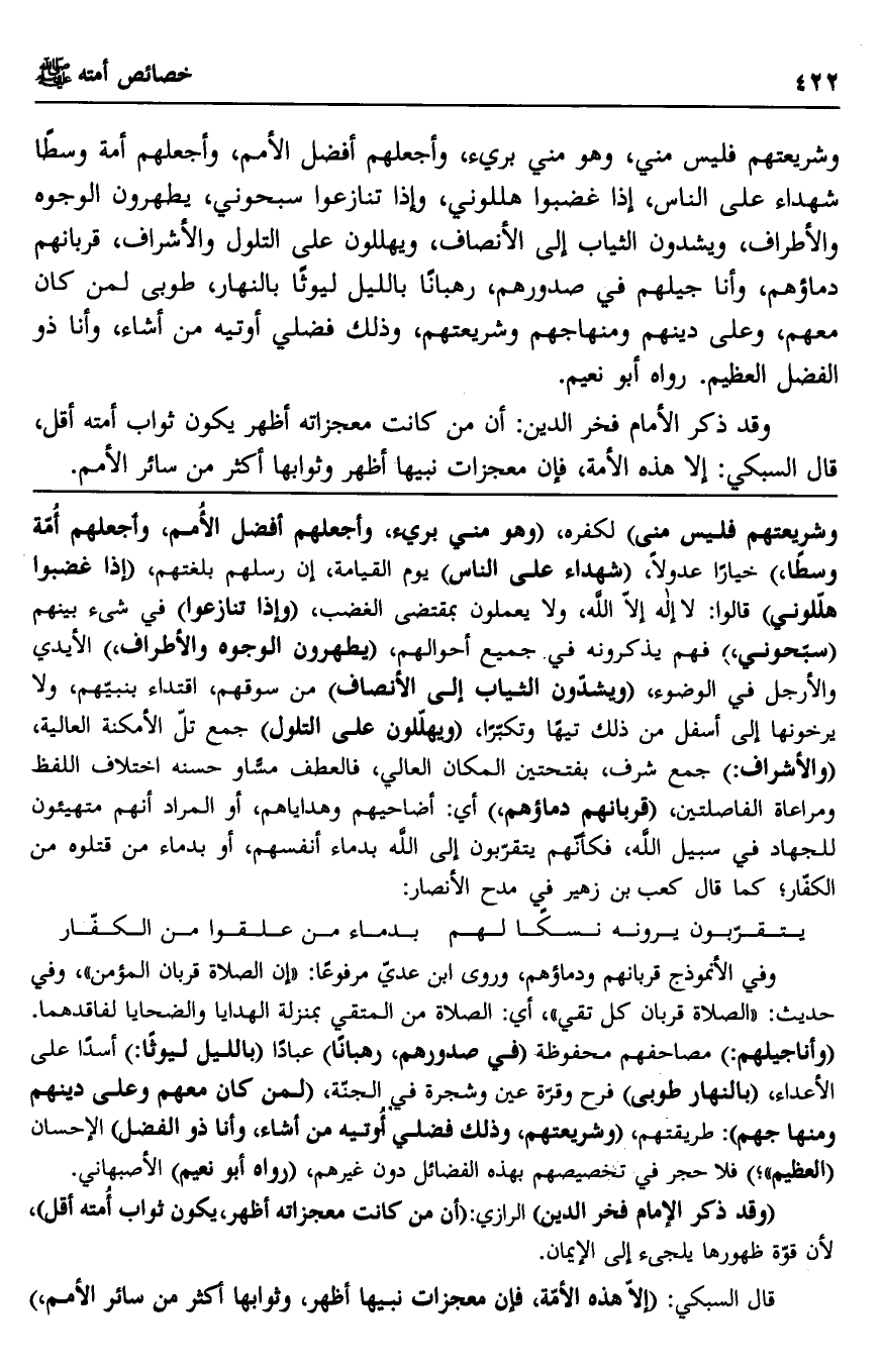 قال السبكي: "إلا هذه الأمة، فإن معجزات نبيها أظهر، وثوابها أكثر من سائر الأمم".