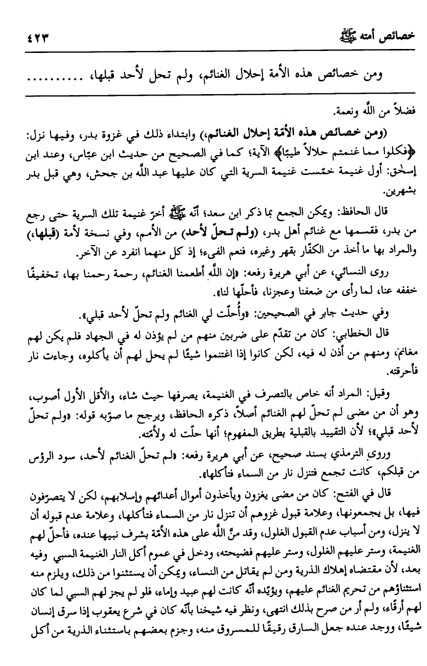 "ومن خصائص هذه الأمة إحلال الغنائم" وابتداء ذلك في غزوة بدر، وفيها نزل: {فَكُلُوا مِمَّا غَنِمْتُمْ حَلَالًا طَيِّبًا} الآية، كما في الصحيح من حديث ابن عباس، وعند ابن إسحاق: أول غنيمة خمست غنيمة السرية التي كان عليها عبد الله بن جحش، وهو قبل بدر بشهرين.