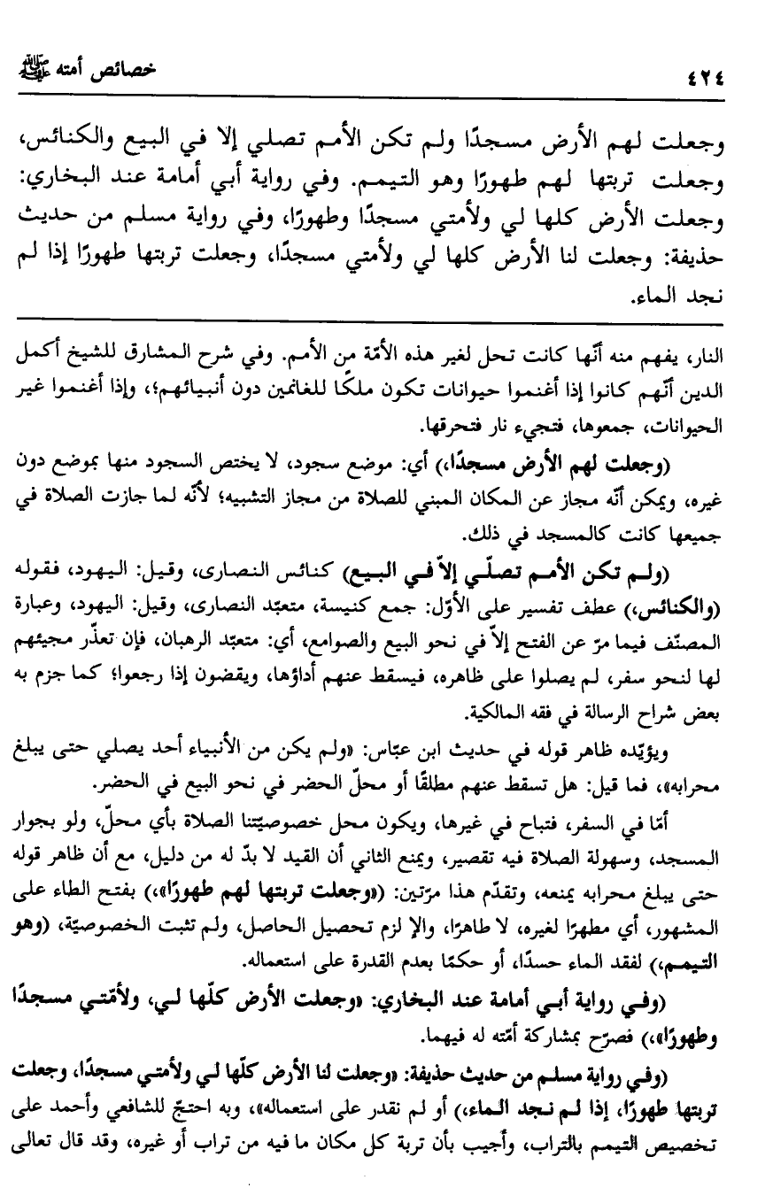 وجعلت لهم الأرض مسجدًا ولم تكن الأمم تصلي إلا في البيع والكنائس، وجعلت تربتها لهم طهورًا وهو التيمم. وفي رواية أبي أمامة عند البخاري: "وجعلت الأرض كلها لي ولأمتي مسجدًا وطهورًا". وفي رواية مسلم من حديث حذيفة: "وجعلت لنا الأرض كلها لي ولأمتي مسجدًا، وجعلت تربتها طهورًا إذا لم نجد الماء".