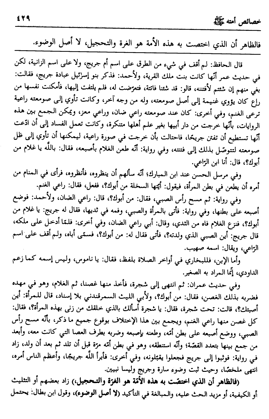"فالظاهر أن الذي اختصت به هذه الأمة هو الغرة والتحجيل" زاد بعضهم أو التثليث أو الكيفية، أو مزيد الحث عليه، والمبالغة في التأكيد "لا أصل الوضوء" وقول ابن بطال: يحتمل