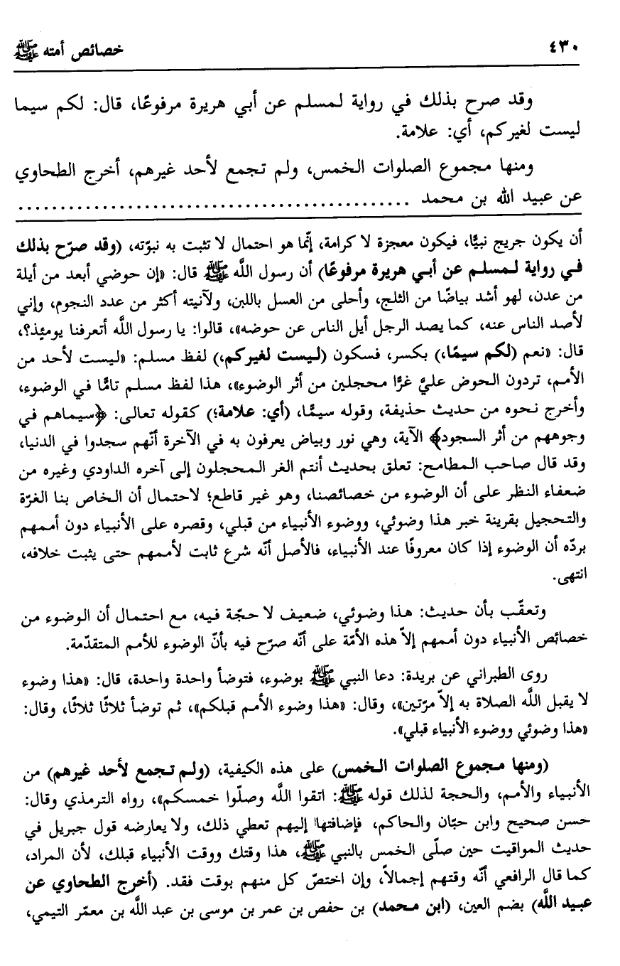 وتعقب بأن حديث: هذا وضوئي، ضعيف لا حجة فيه، مع احتمال أن الوضوء من خصائص الأنبياء دون أممهم إلا هذه الأمة على أنه صرح فيه بأن الوضوء للأمم المتقدمة.