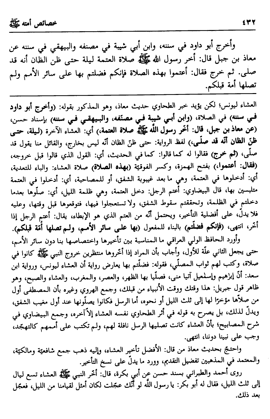 وأخرج أبو داود في سننه، وابن أبي شيبة في مصنفه والبيهقي في سننه عن معاذ بن جبل قال: أخر رسول الله صلى الله عليه وسلم صلاة العتمة ليلة حتى ظن الظان أنه قد صلى, ثم خرج فقال: "أعتموا بهذه الصلاة فإنكم فضلتم بها على سائر الأمم ولم تصلها أمة قبلكم".