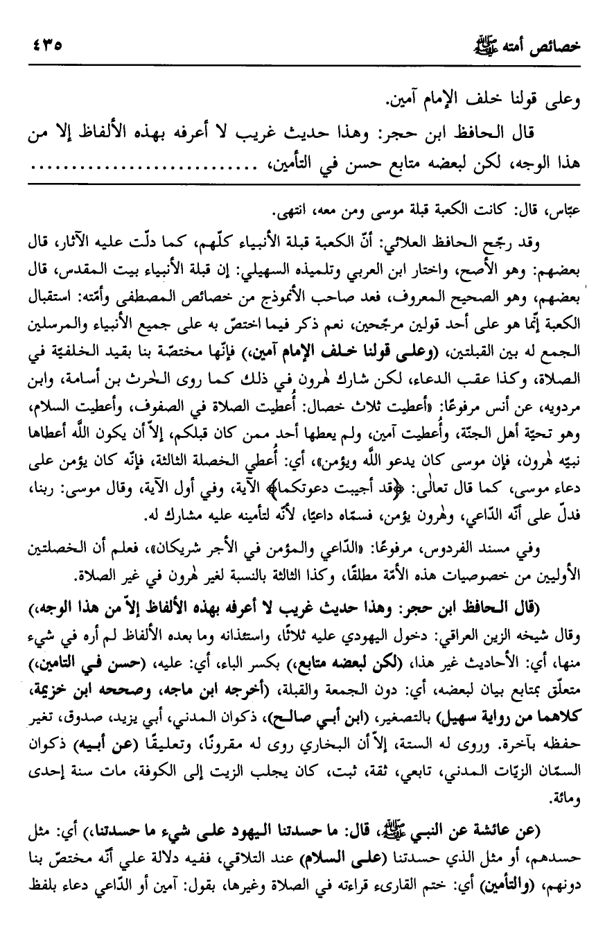 وقد رجح الحافظ العلائي: أن الكعبة قبلة الأنبياء كلهم، كما دلت عليه الآثار، قال بعضهم: وهو الأصح، واختار ابن العربي وتلميذه السهيلي أن قبلة الأنبياء بيت المقدس، قال بعضهم، وهو الصحيح المعروف، فعد صاحب الأنموذج من خصائص المصطفى وأمته: استقبال الكعبة إنما هو على أحد قولين مرجحين، نعم ذكر فيما اختص به على جميع الأنبياء والمرسلين الجمع له بين القبلتين، "وعلى قولنا خلف الإمام آمين" فإنها مختصة بنا بقيد الخلفية في الصلاة، وكذا عقب الدعاء، لكن شارك هارون في ذلك كما روى الحارث بن أسامة، وابن مردويه، عن أنس مرفوعًا: "أعطيت ثلاث خصال: أعطيت الصلاة في الصفوف، وأعطيت السلام، وهو تحية أهل الجنة، وأعطيت آمين، ولم يعطها أحد ممن كان قبلكم، إلا أن يكون الله أعطاها نبيه هارون، فإن موسى كان يدعو الله ويؤمن". أي: أعطي الخصلة الثالثة، فإنه كان يؤمن على دعاء موسى، كما قال تعالى: {قَدْ أُجِيبَتْ دَعْوَتُكُمَا} الآية، وفي أول الآية، وقال موسى: ربنا، فدل على أنه الداعي، وهارون يؤمن، فسماه داعيًا، لأنه لتأمينه عليه مشارك له.