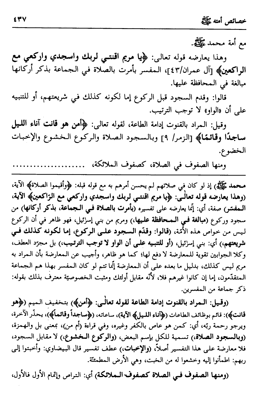 وهذا يعارضه قوله تعالى: {يَا مَرْيَمُ اقْنُتِي لِرَبِّكِ وَاسْجُدِي وَارْكَعِي مَعَ الرَّاكِعِينَ} [آل عمران: 43] ، المفسر بأمرت بالصلاة في الجماعة بذكر أركانها مبالغة في المحافظة عليها.