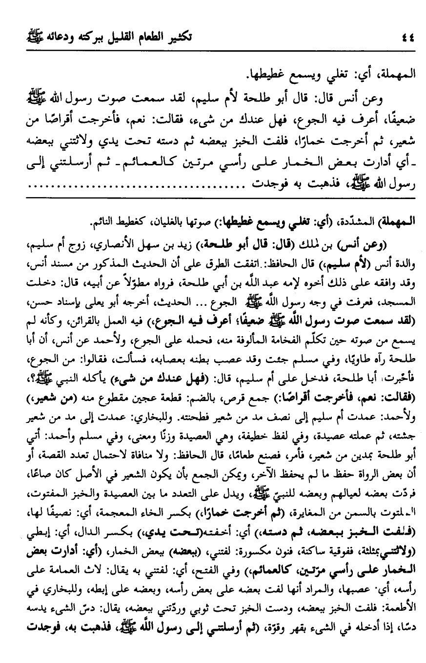 وعن أنس قال: قال أبو طلحة لأم سليم، لقد سمعت صوت رسول الله صلى الله عليه وسلم ضعيفًا، أعرف فيه الجوع، فهل عندك من شيء، فقالت: نعم، فأخرجت أقراصًا من شعير، ثم أخرجت خمارًا، فلفت الخبز ببعضه ثم دسته تحت يدي ولاثتني ببعضه -أي أدارت بعض الخمار على رأسي مرتين كالعمائم- ثم أرسلتني إلى رسول الله صلى الله عليه وسلم، فذهبت به فوجدت