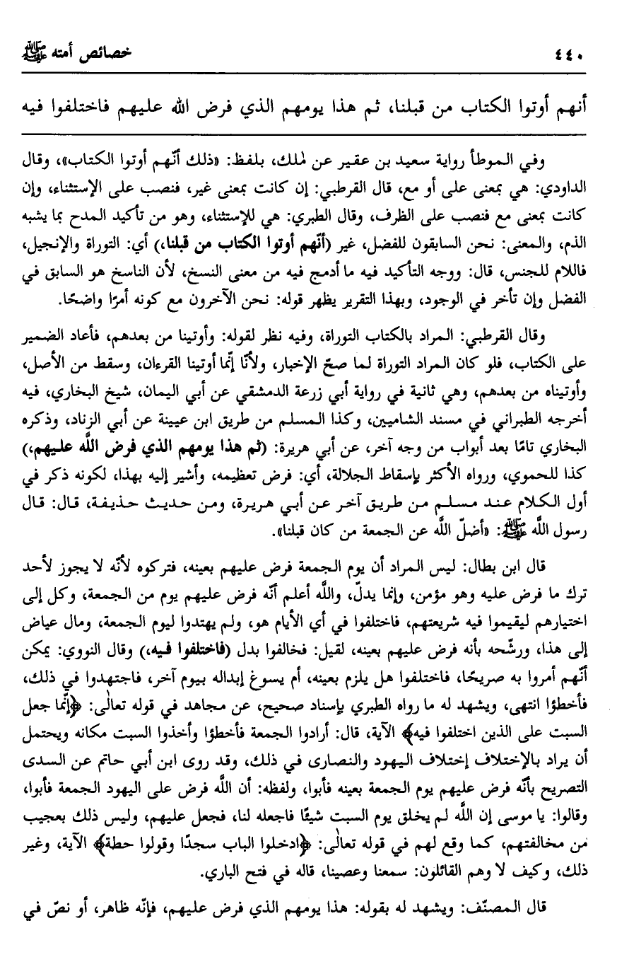 وفي الموطأ رواية سعيد بن عقير عن مالك، بلفظ: "ذلك أنهم أوتوا الكتاب"، وقال الداودي: هي بمعنى على أو مع، قال القرطبي: إن كانت بمعنى غير، فنصب على الاستثناء، وإن كانت بمعنى مع فنصب على الظرف، وقال الطبري: هي للاستثناء، وهو من تأكيد المدح بما يشبه الذم، والمعنى: نحن السابقون للفضل، غير "أنهم أوتوا الكتاب من قبلنا" أي: التوراة والإنجيل، فاللام للجنس، قال: ووجه التأكيد فيه ما أدمج فيه من معنى النسخ، لأن الناسخ هو السابق في الفضل وإن تأخر في الوجود، وبهذا التقرير يظهر قوله: نحن الآخرون مع كونه أمرًا واضحًا.