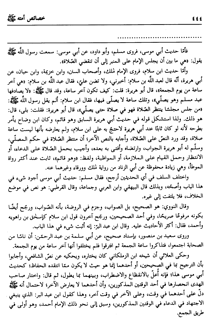 وأما حديث ابن سلام، فروى الإمام مالك، وأصحاب السنن، وابن خزيمة، وابن حبان، عن أبي هريرة، أنه قال لعبد الله بن سلام، أخبرني، ولا تضن عليّ، فقال عبد الله بن سلام: "هي آخر ساعة من يوم الجمعة" قال أبو هريرة: قلت: كيف تكون آخر ساعة، وقد قال صلى الله عليه وسلم: "لا يصادفها عبد مسلم وهو يصلي"، وتلك ساعة لا يصلى فيها، فقال ابن سلام: ألم يقل رسول الله صلى الله عليه وسلم: "من جلس مجلسًا ينتظر الصلاة فهو في صلاة حتى يصلي"، قال أبو هريرة: فقلت: بلى، قال: هو ذلك. ولذا استشكل قوله في حديث أبي هريرة السابق وهو قائم، وكان ابن وضاح يأمر بطرحه لأنه لو كان ثابتًا عند أبي هريرة لاحتج به على ابن سلام، ولم يعارضه بأنها ليست ساعة صلاة، وقد ورد النص على الصلاة، وأجابه بالنص الآخر؛ أن منتظر الصلاة في حكم المصلي، وسلم له أبو هريرة الجواب، وارتضاه وأفتى به بعده، وأجيب بحمل الصلاة على الدعاء، أو الانتظار وحمل القيام على الملازمة، أو المواظبة، ولفظ: "وهو قائم"، ثابت عند أكثر رواة الموطأ، وهي زيادة محفوظة عن أبي الزناد من رواية مالك وورقاء وغيرهما عنه.