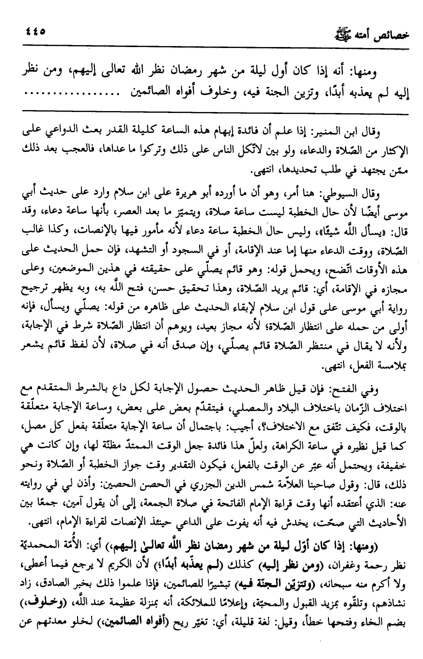 وقال السيوطي: هنا أمر، وهو أن ما أورده أبو هريرة على ابن سلام وارد على حديث أبي موسى أيضًا لأن حال الخطبة ليست ساعة صلاة، ويتميز ما بعد العصر، بأنها ساعة دعاء، وقد قال: "يسأل الله شيئًا"، وليس حال الخطبة ساعة دعاء لأنه مأمور فيها بالإنصات، وكذا غالب الصلاة، ووقت الدعاء منها إما عند الإقامة، أو في السجود أو التشهد، فإن حمل الحديث على هذه الأوقات اتضح، ويحمل قوله: وهو قائم يصلي على حقيقته في هذين الموضعين، وعلى مجازه في الإقامة، أي: قائم يريد الصلاة، وهذا تحقيق حسن, فتح الله به، وبه يظهر ترجيح رواية أبي موسى على قول ابن سلام لإبقاء الحديث على ظاهره من قوله: يصلي ويسأل، فإنه أولى من حمله على انتظار الصلاة؛ لأنه مجاز بعيد، ويوهم أن انتظار الصلاة شرط في الإجابة، ولأنه لا يقال في منتظر الصلاة قائم يصلي، وإن صدق أنه في صلاة، لأن لفظ قائم يشعر بملامسة الفعل، انتهى.