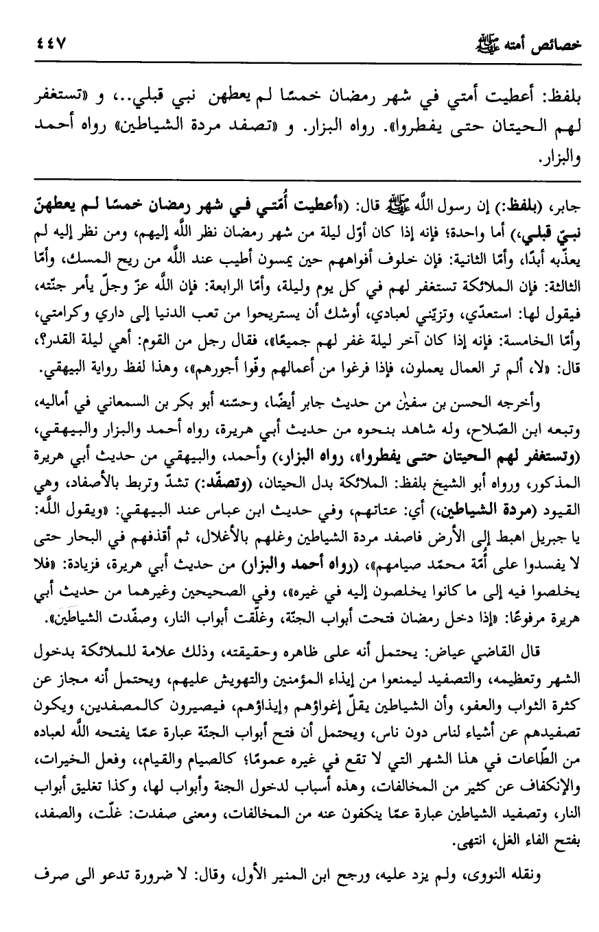 بلفظ: "أعطيت أمتي في شهر رمضان خمسًا لم يعطهن نبي قبلي ... وتستغفر لهم الحيتان حتى يفطروا". رواه البزار. "وتصفد مردة الشياطين" رواه أحمد والبزار.