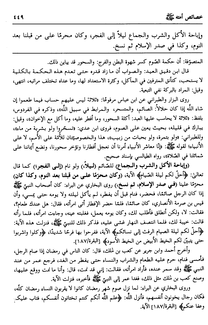 "وإباحة الأكل والشرب والجماع" للصائم "ليلا" ولو نام "إلى الفجر" كما قال تعالى {أُحِلَّ لَكُمْ لَيْلَةَ الصِّيَامِ} الآية، "وكان محرمًا على من قبلنا بعد النوم، وكذا كان" محرمًا علينا "في صدر الإسلام، ثم نسخ" روى البخاري عن البراء: كان أصحاب النبي صلى الله عليه وسلم إذا كان الرجل صائمًا، فحضر، فنام قبل أن يفطر، لم يأكل ليلته ولا يومه حتى يمسي، وأن قيس بن صرمة الأنصاري، كان صائمًا، فلما حضر الإفطار أتى امرأته، فقال: هل عندك طعام؟ فقالت: لا، ولكن أنطلق فأطلب لك، وكان يومه يعمل، فغلبته عينه، وجاءت امرأته، فلما رأته قالت: خيبة لك، فلما انتصف النهار غشي عليه، فذكر ذلك للنبي صلى الله عليه وسلم، فنزلت هذه الآية: {أُحِلَّ لَكُمْ لَيْلَةَ الصِّيَامِ الرَّفَثُ إِلَى نِسَائِكُمْ} الآية، ففرحوا بها فرحًا شديدًا، {وَكُلُوا وَاشْرَبُوا حَتَّى يَتَبَيَّنَ لَكُمُ الْخَيْطُ الْأَبْيَضُ مِنَ الْخَيْطِ الْأَسْوَدِ} [البقرة: 187] .