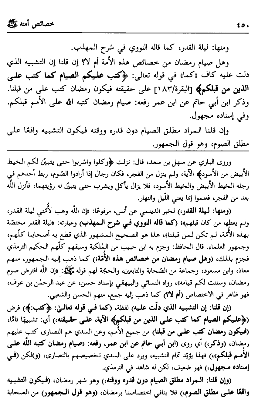 "ومنها: ليلة القدر" لخبر الديلمي عن أنس، مرفوعًا: "إن الله وهب لأمتي ليلة القدر، ولم يعطها من كان قبلهم". "كما قاله النووي في شرح المهذب" وعبارته: "ليلة القدر مختصة بهذه الأمة، لم تكن لمن قبلنا"، هذا هو الصحيح المشهور الذي قطع به أصحابنا كلهم، وجمهور العلماء، قال الحافظ: وجزم به ابن حبيب من المالكية وسبقهم كلهم الحكيم الترمذي فجزم بذلك، "وهل صيام رمضان من خصائص هذه الأة" كما ذهب إليه الجمهور، منهم معاذ، وابن مسعود، وجماعة من الصحابة والتابعين، والحجة لهم قوله صلى الله عليه وسلم: "إن الله افترض صوم رمضان، وسننت لكم قيامه" رواه النسائي والبيهقي بإسناد حسن، عن عبد الرحمن بن عوف، فهو ظاهر في الاختصاص "أم لا؟ " كما ذهب إليه جمع، منهم الحسن والشعبي.