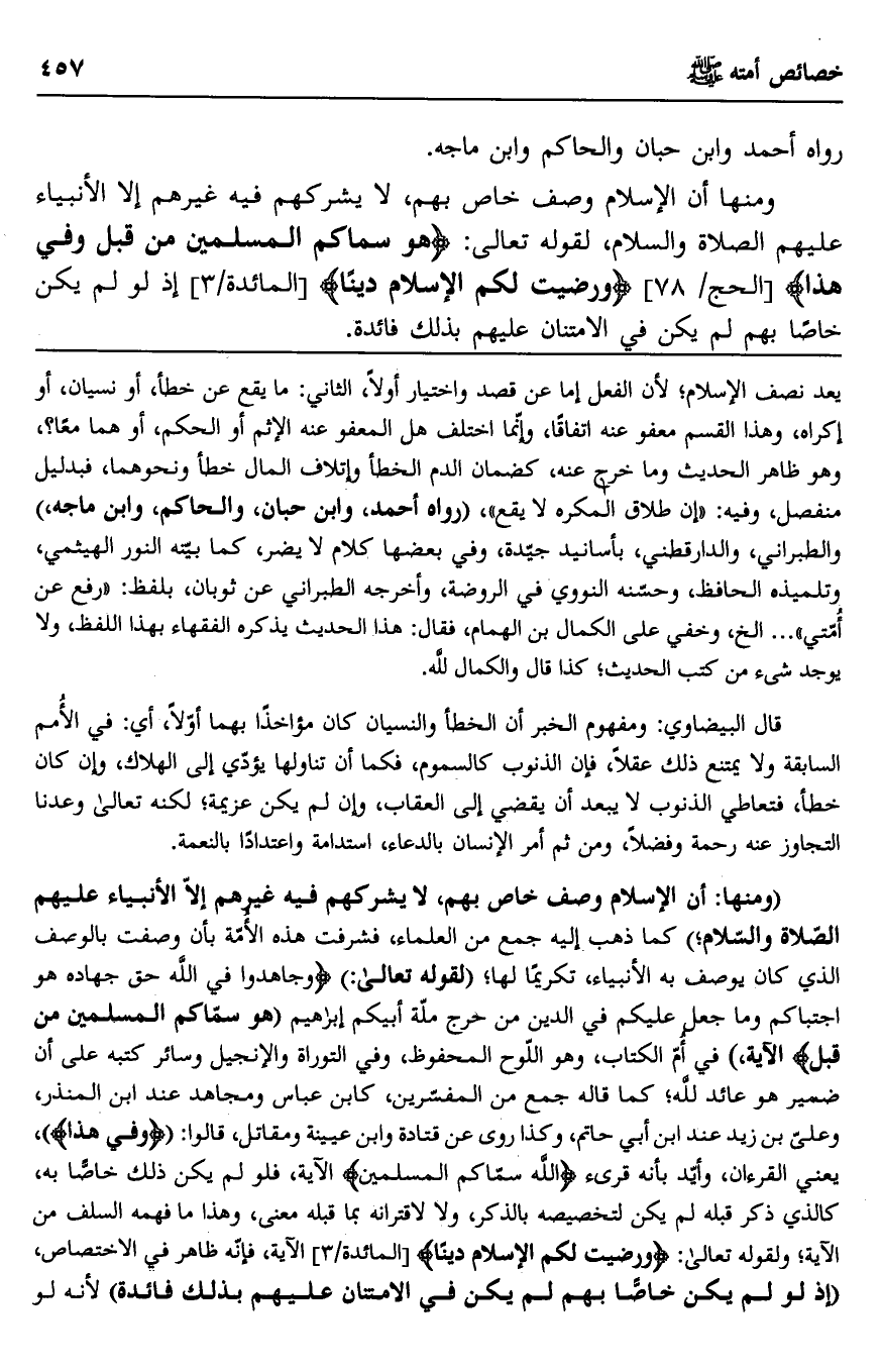 "ومنها: أن الإسلام وصف خاص بهم، ولا يشركهم فيه غيرهم إلا الأنبياء عليهم الصلاة والسلام" كما ذهب إليه جمع من العلماء، فشرفت هذه الأمة بأن وصفت بالوصف الذي كان يوصف به الأنبياء، تكريمًا لها؛ "لقوله تعالى": {وَجَاهِدُوا فِي اللَّهِ حَقَّ جِهَادِهِ هُوَ اجْتَبَاكُمْ وَمَا جَعَلَ عَلَيْكُمْ فِي الدِّينِ مِنْ حَرَجٍ مِلَّةَ أَبِيكُمْ إِبْرَاهِيمَ هُوَ سَمَّاكُمُ الْمُسْلِمِينَ مِنْ قَبْلُ} الآية في أم الكتاب، وهو اللوح المحفوظ، وفي التوراة والإنجيل وسائر كتبه على أن ضمير هو عائد لله؛ كما قاله جمع من المفسرين، كابن عباس ومجاهد عند ابن المنذر، وعلى بن زيد عند ابن أبي حاتم، وكذا روى عن قتادة وابن عيينة ومقاتل، قالوا: {وَفِي هَذَا} ، يعني القرآن، وأيد بأنه قرئ "الله سماكم المسلمين" الآية، فلو لو يكن ذلك خاصًا به، كالذي ذكر قبله لم يكن لتخصيصه بالذكر، ولا لاقترانه بما قبله معنى، وهذا ما فهمه السلف من الآية، ولقوله تعالى: {وَرَضِيتُ لَكُمُ الْإِسْلَامَ دِينًا} [المائدة: 3] الآية، فإنه ظاهر في الاختصاص، "إذ لو لم يكن خاصا بهم لم يكن في الامتنان عليهم بذلك فائدة" لأنه لو