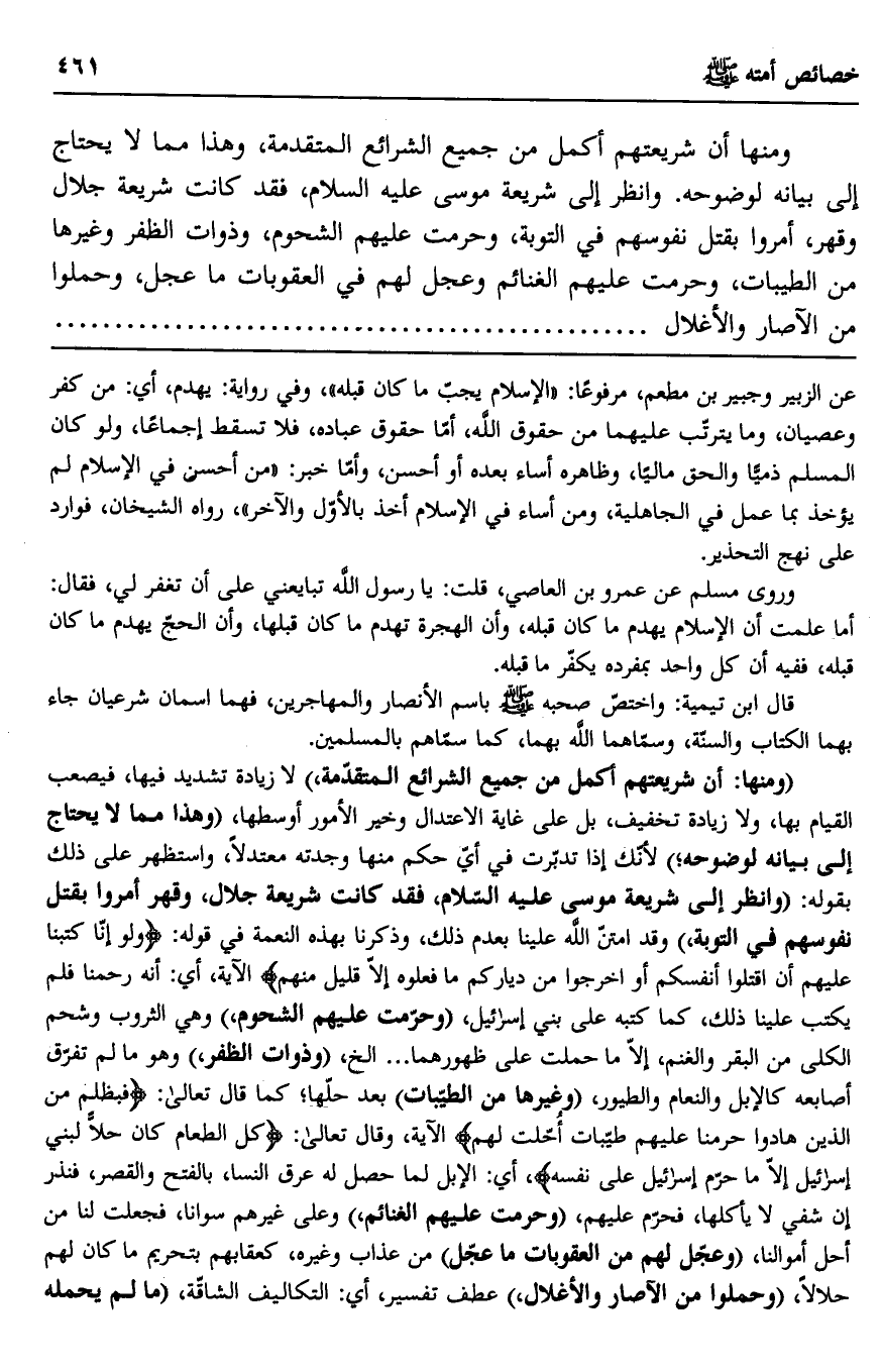 ومنها أن شريعتهم أكمل من جميع الشرائع المتقدمة، وهذا مما لا يحتاج إلى بيانه لوضوحه. وانظر إلى شريعة موسى عليه السلام, فقد كانت شريعة جلال وقهر، أمروا بقتل نفوسهم في التوبة، وحرمت عليهم الشحوم، وذوات الظفر وغيرها من الطيبات، وحرمت عليهم الغنائم وعجل لهم في العقوبات ما عجل، وحملوا من الآصار والأغلال.