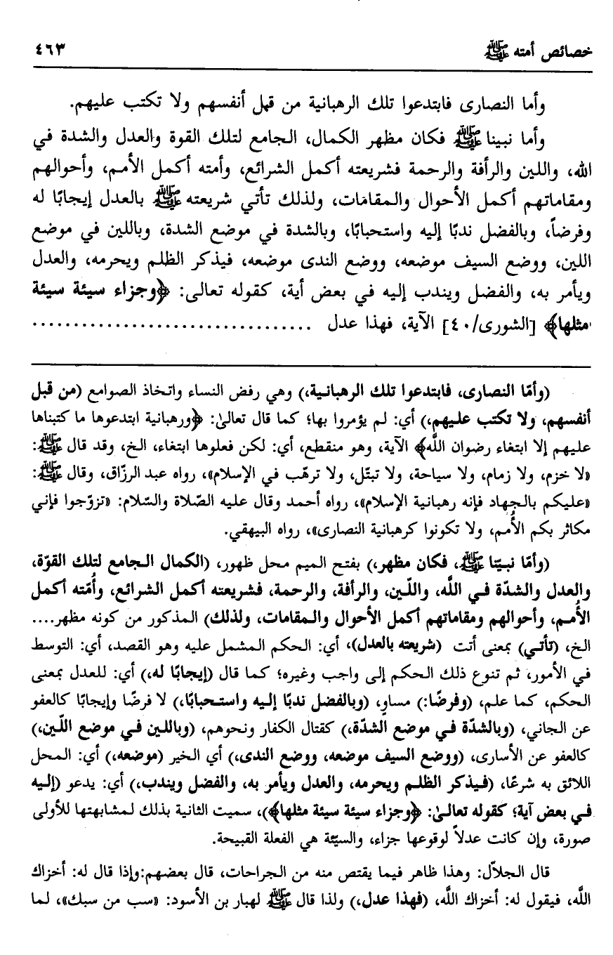 وأما نبينا صلى الله عليه وسلم فكان مظهر الكمال، الجامع لتلك القوة والعدل والشدة في الله، واللين والرأفة والرحمة فشريعته أكمل الشرائع، وأمته أكمل الأمم، وأحوالهم ومقاماتهم أكمل الأحوال والمقامات، ولذلك تأتي شريعته صلى الله عليه وسلم بالعدل إيجابًا له وفرضًا، وبالفضل ندبًا إليه واستحبابًا، وبالشدة في موضع الشدة، وباللين في موضع اللين، ووضع السيف موضعه، ووضع الندى موضعه، فيذكر الظلم ويحرمه، والعدل ويأمر به، والفضل ويندب إليه في بعض آية، كقوله تعالى: {وَجَزَاءُ سَيِّئَةٍ سَيِّئَةٌ مِثْلُهَا} [الشورى: 40] الآية، فهذا عدل.