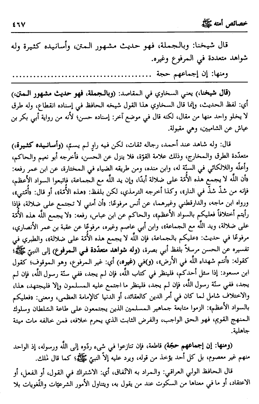 قال: وله شاهد عند أحمد، رجاله ثقات، لكن فيه راوٍ لم يسم، "وأسانيده كثيرة" متعددة الطرق والمخارج، وذلك علامة القوة، فلا ينزل عن الحسن، فأخرجه أبو نعيم والحاكم، وأعله اللالكائي في السنة له، وابن منده، ومن طريقه الضياء في المختارة، عن ابن عمر رفعه: "أن الله لا يجمع هذه الأمة على ضلالة أبدًا، وإن يد الله مع الجماعة، فاتبعوا السواد الأعظم، فإن من شذ شذ في النار"، وكذا أخرجه الترمذي، لكن بلفظ: "هذه الأمة"، أو قال: "أمتي"، ورواه ابن ماجه، والدارقطني وغيرهما، عن أنس مرفوعًا: "أن أمتي لا تجتمع على ضلالة، فإذا رأيتم اختلافًا فعليكم بالسواد الأعظم"، والحاكم عن ابن عباس، رفعه: "لا يجمع الله هذه الأمة على ضلالة، ويد الله مع الجماعة". وابن أبي عاصم وغيره، مرفوعا عن عقبة بن عمر الأنصاري، مرفوعًا في حديث: "عليكم بالجماعة، فإن الله لا يجمع هذه الأمة على ضلالة"، والطبري في تفسيره عن الحسن مرسلا بلفظ أبي بصرة، "وله شواهد متعددة في المرفوع" إلى النبي صلى الله عليه وسلم؛ كقوله: "أنتم شهداء الله في الأرض"، "و" في "غيره" أي: غير المرفوع، وهو الموقوف؛ كقول ابن مسعود: إذا سئل أحدكم، فلينظر في كتاب الله، فإن لم يجد، ففي سنة رسول الله، فإن لم يجد، فلينظر ما اجتمع عليه المسلمون وإلا فليجتهد، هذا، والاختلاف شامل لما كان في أمر الدين كالعقائد، أو الدنيا كالإمامة العظمى، ومعنى: "فعليكم بالسواد الأعظم". الزموا متابعة جماهير المسلمين الذين يجتمعون على طاعة السلطان وسلوك المنهج القويم، فهو الحق الواجب، والفرض الثابت الذي يحرم خلافه، فمن خالفه مات ميتة جاهلية.