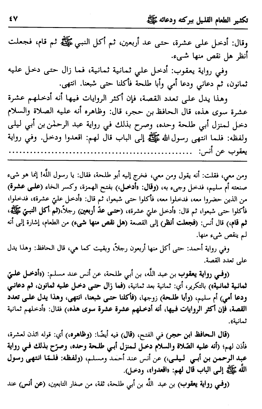 وفي رواية يعقوب: "أدخل عليّ ثمانية ثمانية"، فما زال حتى دخل عليه ثمانون، ثم دعاني ودعا أمي وأبا طلحة فأكلنا حتى شبعنا. انتهى.