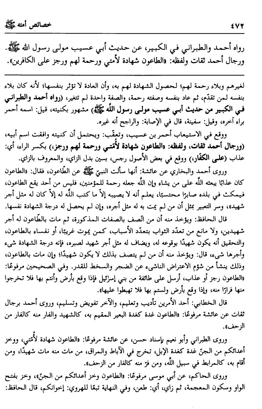 ورجال أحمد ثقات ولفظه: "الطاعون شهادة لأمتي ورحمة لهم ورجز على الكافرين".