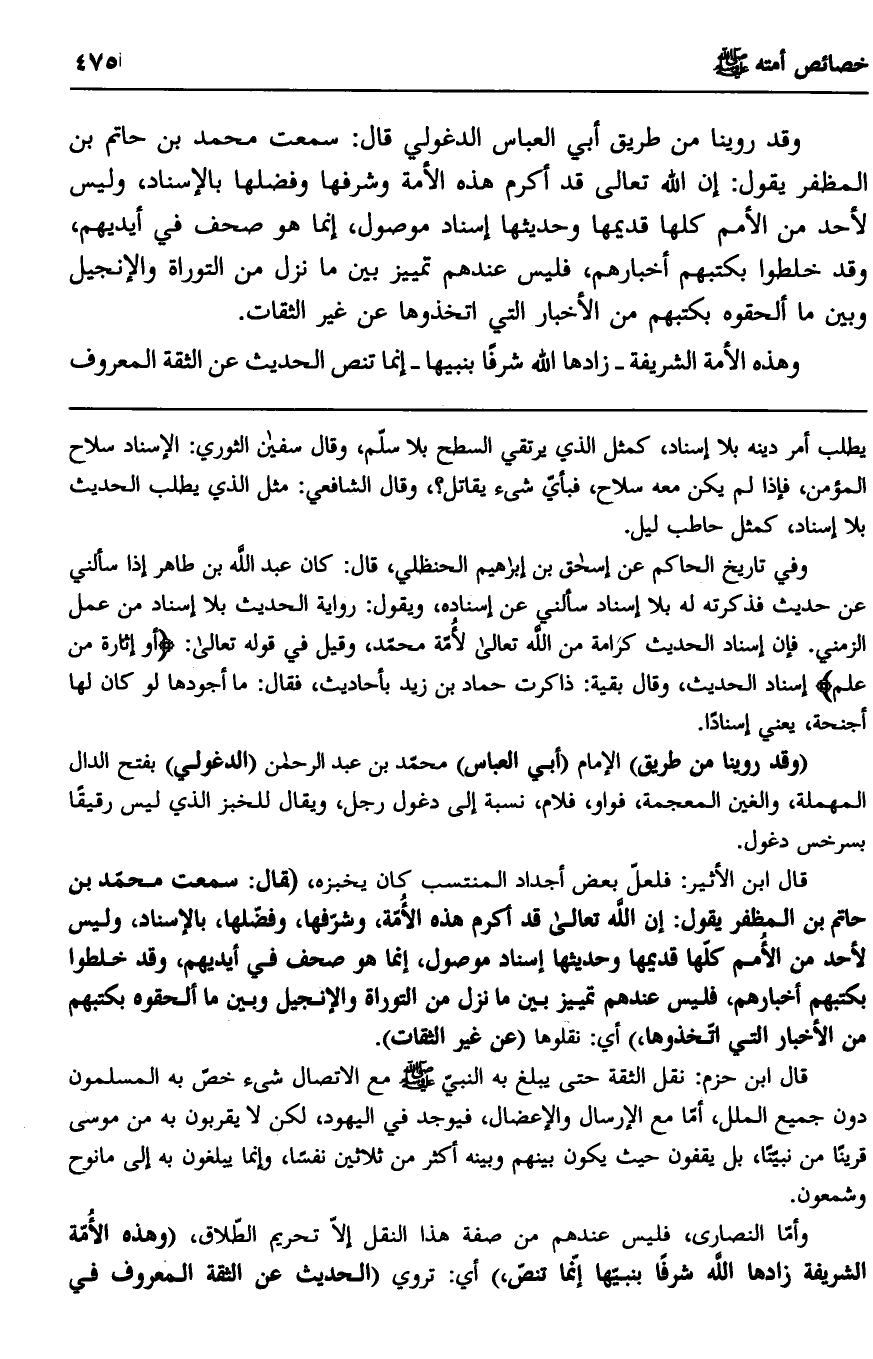 وقد روينا من طريق أبي العباس الدغولي قال: سمعت محمد بن حاتم بن المظفر يقول: إن الله تعالى قد أكرم هذه الأمة وشرفها وفضلها بالإسناد، وليس لأحد من الأمم كلها قديمها وحديثها إسناد موصول، إنما هو صحف في أيديهم، وقد خلطوا بكتبهم أخبارهم، فليس عندهم تمييز بين ما نزل من التوراة والإنجيل وبين ما ألحقوه بكتبهم من الأخبار التي اتخذوها عن غير الثقات.