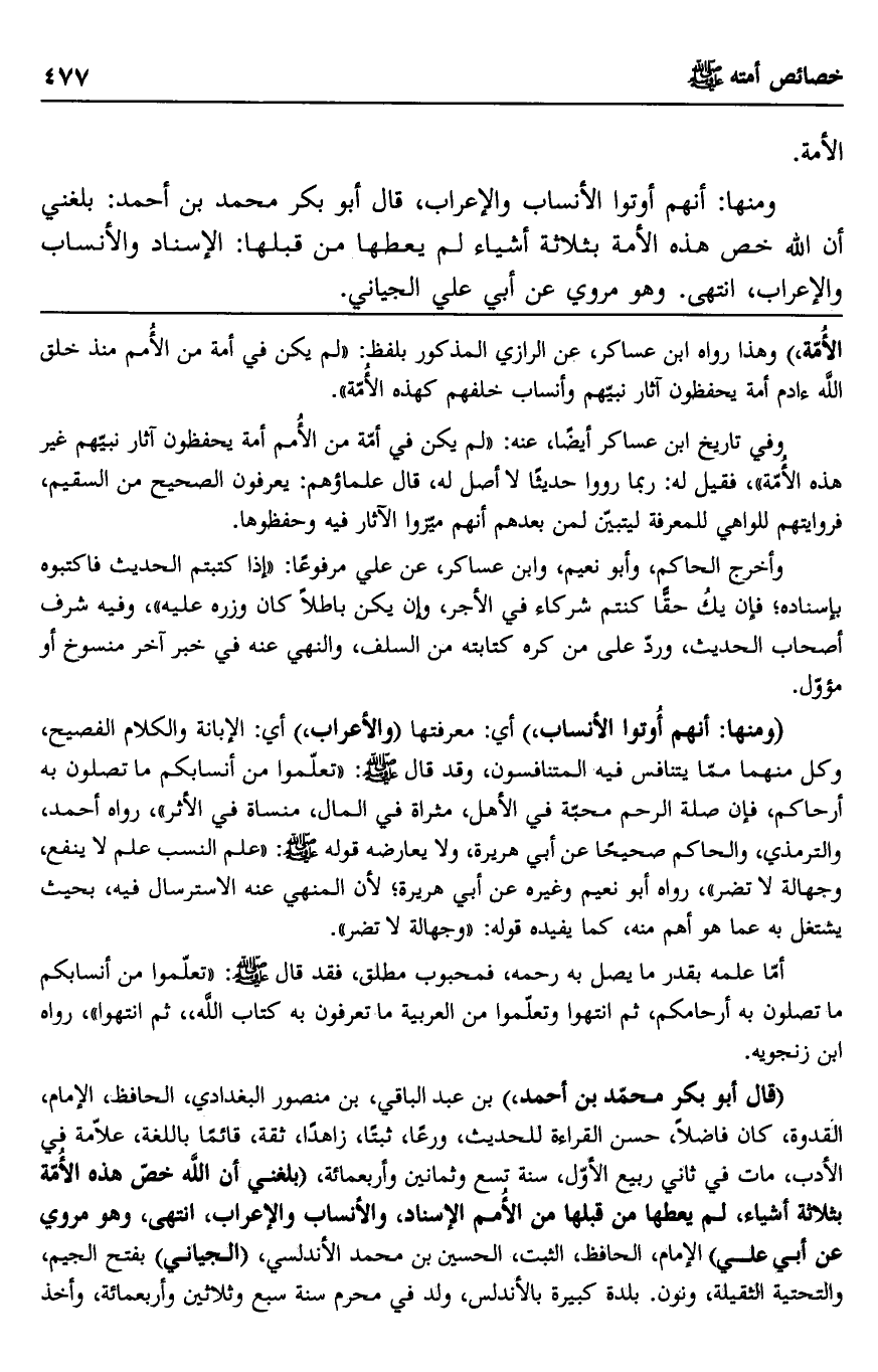 "قال أبو بكر محمد بن أحمد" بن عبد الباقي، بن منصور البغدادي، الحافظ، الإمام، القدوة، كان فاضلا، حسن القراءة للحديث، ورعًا، ثبتًا، زاهدًا، ثقة، قائمًا باللغة، علامة في الأدب، مات في ثاني ربيع الأول، سنة تسع وثمانين وأربعمائة، "بلغني أن الله خص هذه الأمة بثلاثة أشياء، لم يعطها من قبلها من الأمم الإسناد، والأنساب والإعراب، انتهى، وهو مروي عن أبي علي" الإمام، الحافظ، الثبت، الحسين بن محمد الأندلسي، "الجياني" بفتح الجيم، والتحتية الثقيلة، ونون. بلدة كبيرة بالأندلس، ولد في محرم سنة سبع وثلاثين وأربعمائة، وأخذ
