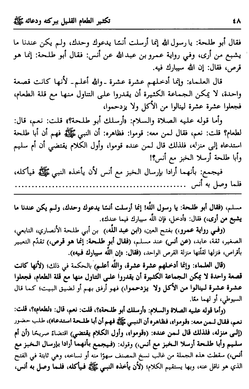 مسلم، "فقال أبو طلحة: يا رسول الله! إنما أرسلت أنسًا يدعوك وحدك، ولم يكن عندنا ما يشبع من أرى" فقال: "أدخل، فإن الله سيبارك فيما عندك".