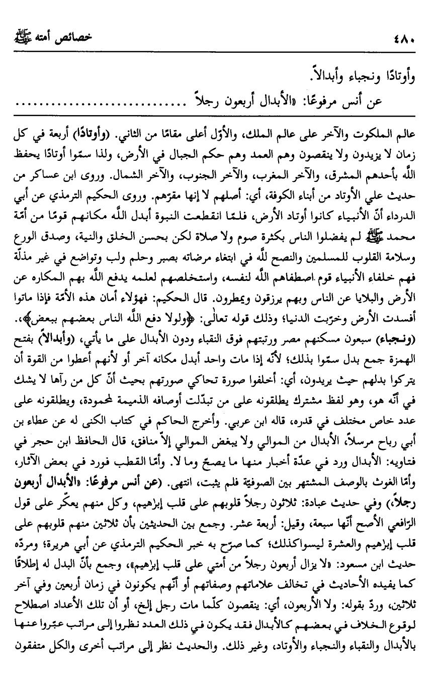 عالم الملكوت والآخر على عالم الملك، والأول أعلى مقامًا من الثاني. "وأوتادًا" أربعة في كل زمان لا يزيدون ولا ينقصون وهم العمد وهم حكم الجبال في الأرض، ولذا سموا أوتادًا يحفظ الله بأحدهم المشرق، والآخر المغرب، والآخر الجنوب، والآخر الشمال. وروى ابن عساكر من حديث علي الأوتاد من أبناء الكوفة، أي: أصلهم لا أنها مقرهم. وروى الحكيم الترمذي عن أبي الدرداء أن الأنبياء كانوا أوتاد الأرض، فلما انقطعت النبوة أبدل الله مكانهم قومًا من أمة محمد صلى الله عليه وسلم لم يفضلوا الناس بكثرة صوم ولا صلاة لكن بحسن الخلق والنية وصدق الورع وسلامة القلوب للمسلمين والنصح لله في ابتغاء مرضاته بصبر وحلم ولب وتواضع في غير مذلة فهم خلفاء الأنبياء قوم اصطفاهم الله لنفسه، واستخلصهم لعلمه يدفع الله بهم المكاره عن الأرض والبلايا عن الناس وبهم يرزقون ويمطرون. قال الحكيم: فهؤلاء أمان هذه الأمة فإذا ماتوا أفسدت الأرض وخربت الدنيا؛ وذلك قوله تعالى: {وَلَوْلَا دَفْعُ اللَّهِ النَّاسَ بَعْضَهُمْ بِبَعْضٍ} "ونجباء" سبعون مسكنهم مصر ورتبتهم فوق النقباء ودون الأبدال على ما يأتي، "وأبدالا" بفتح الهمز جمع بدل سموا بذلك؛ لأنه إذا مات واحد أبدل مكانه آخر أو لأنهم أعطوا من القوة أن يتركوا بدلهم حيث يريدون، أي: أخلفوا صورة تحاكي صورتهم بحيث أن كل من رآها لا يشك في أنه هو، وهو لفظ مشترك يطلقونه على من تبدلت أوصافه الذميمة لمحمودة، ويطلقونه على عدد خاص مختلف في قدره، قاله ابن عربي. وأخرج الحاكم في كتاب الكنى له عن عطاء بن أبي رباح مرسلا، الأبدال من الموالي ولا يبغض الموالي إلا منافق، قال الحافظ ابن حجر في فتاويه: الأبدال ورد في عدة أخبار منها ما يصح وما لا. وأما القطب فورد في بعض الآثار، وأما الغوث بالوصف المشتهر بين الصوفية فلم يثبت، انتهى. عن أنس مرفوعًا: "ألإبدال أربعون رجلا" وفي حديث عبادة: ثلاثون رجلا قلوبهم على قلب إبراهيم، وكل منهم يعكر على قول الرافعي الأصح أنها سبعة، وقيل: أربعة عشر. وجمع بين الحديثين بأن ثلاثين منهم قلوبهم على قلب إبراهيم والعشرة ليسوا كذلك؛ كما صرح به خبر الحكيم الترمذي عن أبي هريرة؛ ومرده حديث ابن مسعود: "لا يزال أربعون رجلا من أمتي على قلب إبراهيم". وجمع بأن البدل له إطلاقًا كما يفيده الأحاديث في تخالف علاماتهم وصفاتهم أو أنهم يكونون في زمان أربعين وفي آخر ثلاثين، ورد بقوله: ولا الأربعون، أي: ينقصون كلما مات رجل ... إلخ، أو أن تلك الأعداد اصطلاح لوقوع الخلاف في بعضهم كالأبدال فقد يكون في ذلك العدد نظروا إلى مراتب عبروا عنها بالأبدال والنقباء والنجباء والأوتاد، وغير ذلك, والحديث نظر إلى مراتب أخرى والكل متفقون