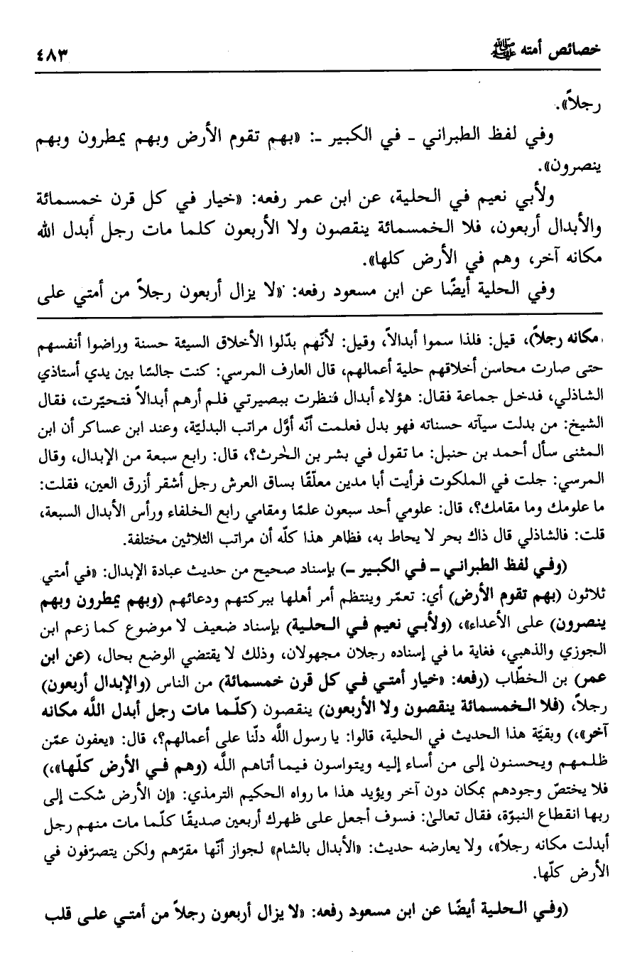 ولأبي نعيم في الحلية، عن ابن عمر رفعه: "خيار في كل قرن خمسمائة والأبدال أربعون، فلا الخمسمائة ينقصون ولا الأربعون كلما مات رجل أبدل الله مكانه آخر، وهم في الأرض كلها".