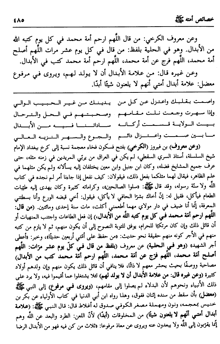 وعن معروف الكرخي: من قال اللهم ارحم أمة محمد في كل يوم كتبه الله من الأبدال. وهو في الحلية بلفظ: من قال في كل يوم عشر مرات اللهم أصلح أمة محمد، اللهم فرج عن أمة محمد، اللهم ارحم أمة محمد كتب في الأبدال.