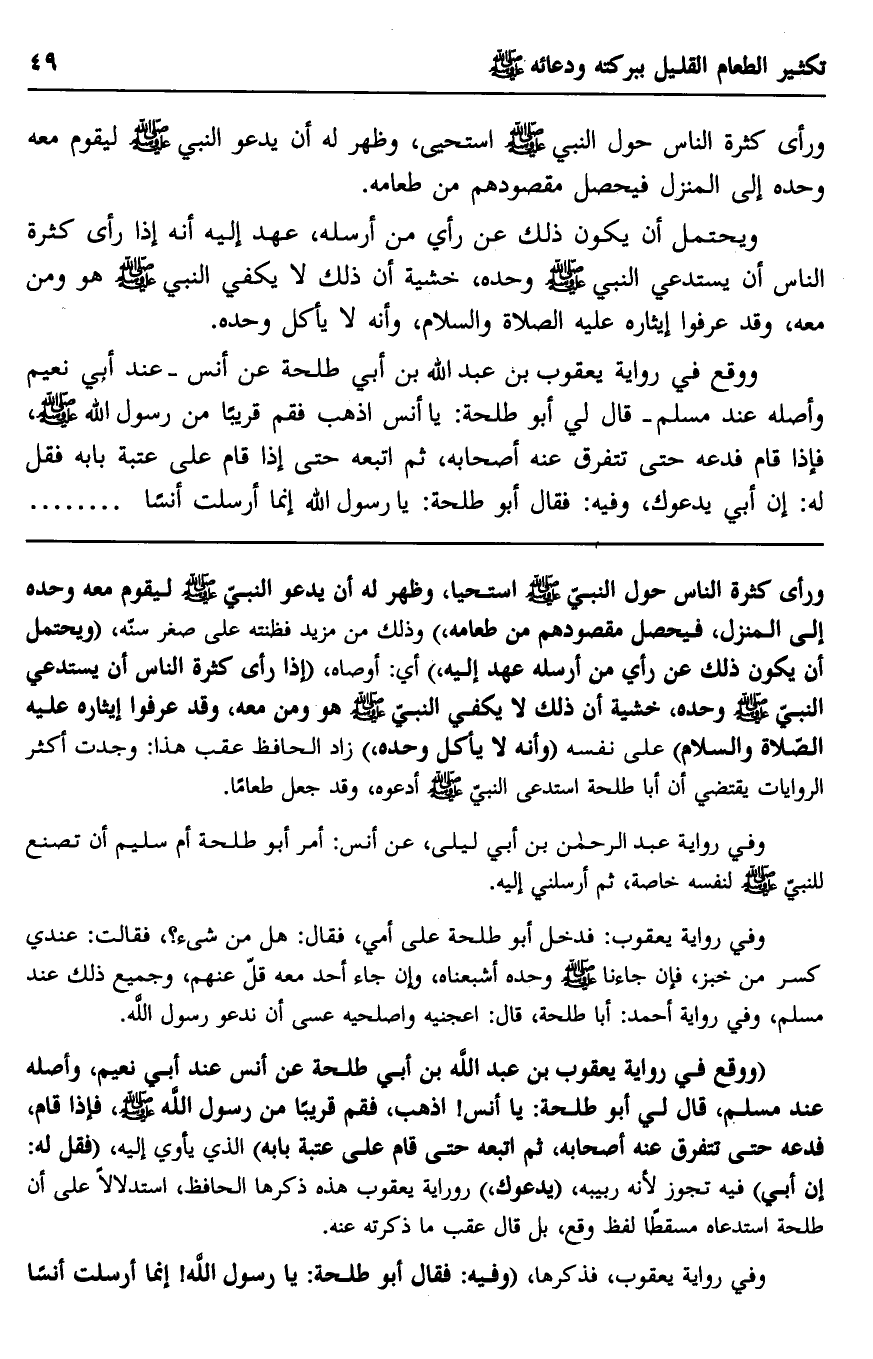 وفي رواية يعقوب: فدخل أبو طلحة على أمي، فقال: هل من شيء؟ فقالت: عندي كسر من خبز، فإن جاءنا صلى الله عليه وسلم وحده أشبعناه، وإن جاء أحد معه قل عنهم، وجميع ذلك عند مسلم، وفي رواية أحمد: أن أبا طلحة قال: أعجنيه وأصلحيه عسى أن ندعو رسول الله.