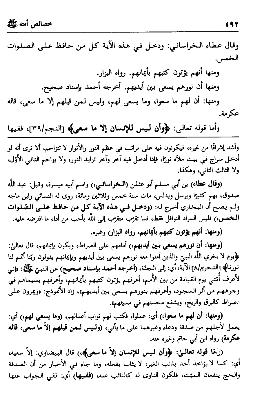 "ومنها: أن لهم ما سعوا" أي: عملوا، فكتب لهم ثواب أعمالهم، "وما يسعى لهم" أ: يعمل لأجلهم من صدقة ودعاء وغيرهما على ما يأتي، "وليس لمن قبلهم إلا ما سعى، قاله عكرمة" رواه ابن أبي حاتم وغيره عنه.