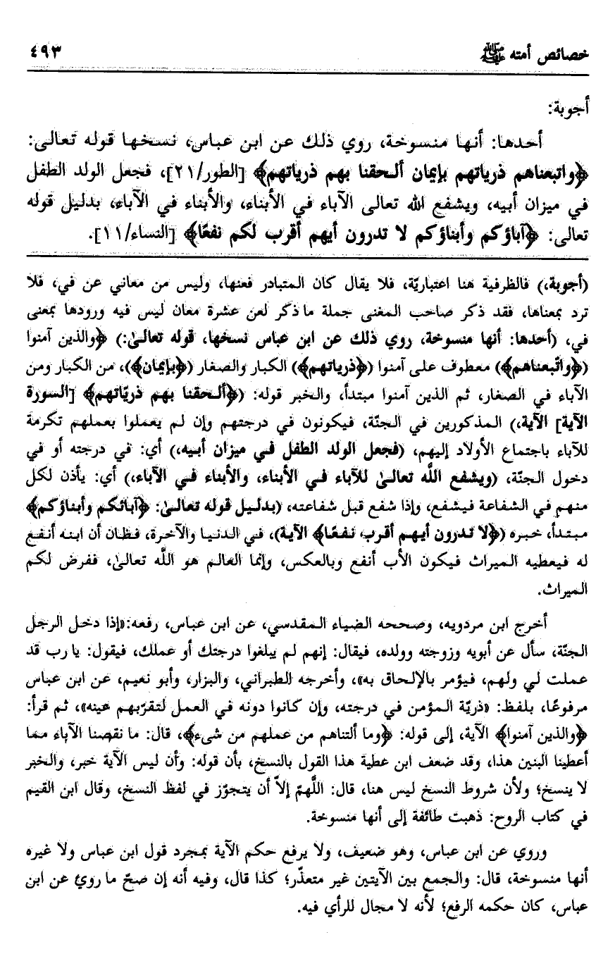 "أجوبة" فالظرفية هنا اعتبارية، فلا يقال كان المتبادر فعنها، وليس من معاني عن في، فلا ترد بمعناها، فقد ذكر صاحب المغني جملة ما ذكر لعن عشرة معان ليس فيه ورودها بمعنى في، "أحدها: أنها منسوخة، روى ذلك عن ابن عباس نسخها، قوله تعالى" {وَالَّذِينَ آمَنُوا وَاتَّبَعَتْهُمْ} معطوف على آمنوا {ذُرِّيَّتُهُمْ} الكبار والصغار {بِإِيمَانٍ} من الكبار ومن الآباء في الصغار، ثم الذين آمنوا مبتدأ، والخبر قوله: {أَلْحَقْنَا بِهِمْ ذُرِّيَّتَهُْ} الآية، المذكورين في الجنة، فيكونون في درجتهم وإن لم يعملوا بعملهم تكرمة للآباء باجتماع الأولاد إليهم، "فجعل الولد الطفل في ميزان أبيه" أي: في درجته أو في دخول الجنة، "ويشفع الله تعالى للآباء في الأبناء، والأبناء في الآباء" أي: يأذن لكل منهم في الشفاعة فيشفع، وإذا شفع قبل شفاعته، "بدليل قوله تعالى: {آبَاؤُكُمْ وَأَبْنَاؤُكُمْ} مبتدأ، خبره {لَا تَدْرُونَ أَيُّهُمْ أَقْرَبُ لَكُمْ نَفْعًا} الآية، في الدنيا والآخرة، فظان أن ابنه أنفع له فيعطيه الميراث فيكون الأب أنفع وبالعكس، وإنما العالم هو الله تعالى، ففرض لكم الميراث.