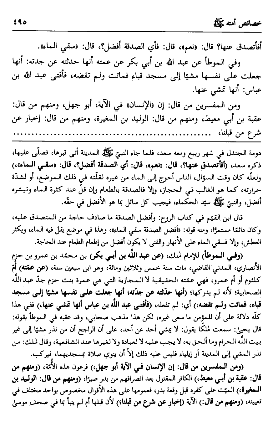 "وفي الموطأ" للإمام مالك، "عن عبد الله بن أبي بكر" بن محمد بن عمرو بن حزم الأنصاري، المدني القاضي، مات سنة خمس وثلاثين ومائة، وهو ابن سبعين سنة، "عن عمته" أم كلثوم أو أم عمرو، فهي عمته الحقيقية لا المجازية التي هي عمرة بنت حزم جد عبد الله الصحابية؛ لأنه لم يدركها؛ "أنها حدته عن جدته؛ أنها جعلت على نفسها مشيًا إلى مسجد قباء، فماتت ولم تقضه" أي: لم تفعله، "فأفتى عبد الله بن عباس أنها تمشي عنها" ففي هذا كله دلالة على أن للمؤمن ما سعى غيره، لكن هذا مذهب صحابي، وقد عقبه في الموطأ بقوله: قال يحيى: سمعت مالكًا يقول: لا يمشي أحد عن أحد، على أن الراجح أن من نذر مشيًا إلى غير بيت الله الحرام وما ألحق به، لا يجب عليه لا لعبادة ولا لغيره عند الشافعية، وقال مالك: من نذر المشي إلى المدينة أو إيلياء فليس عليه ذلك إلا أن ينوي صلاة بمسجديهما، فيركب.