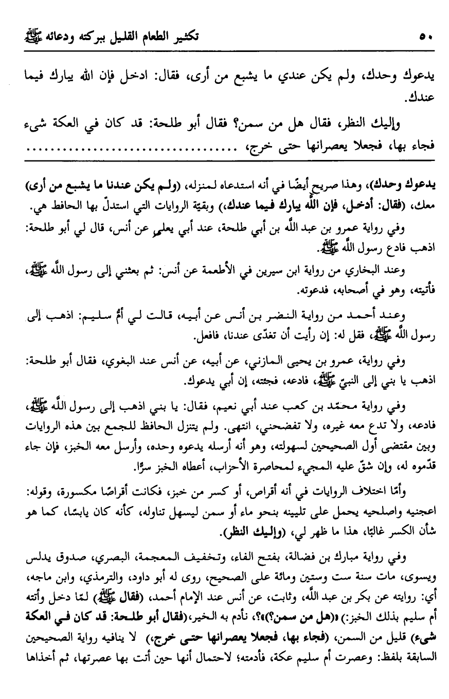 يدعوك وحدك"، وهذا صريح أيضًا في أنه استدعاه لمنزله، "ولم يكن عندنا ما يشبع من أرى" معك، فقال: "أدخل، فإن الله يبارك فيما عندك" وبقية الروايات التي استدل بها الحافظ هي.