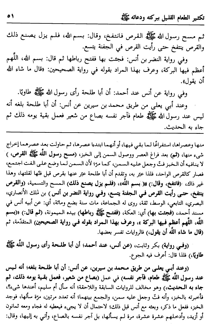 ثم مسح رسول الله صلى الله عليه وسلم القرص فانتفخ، وقال: "بسم الله" , فلم يزل يصنع ذلك والقرص ينتفخ حتى رأيت القرص في الجفنة يتسع.