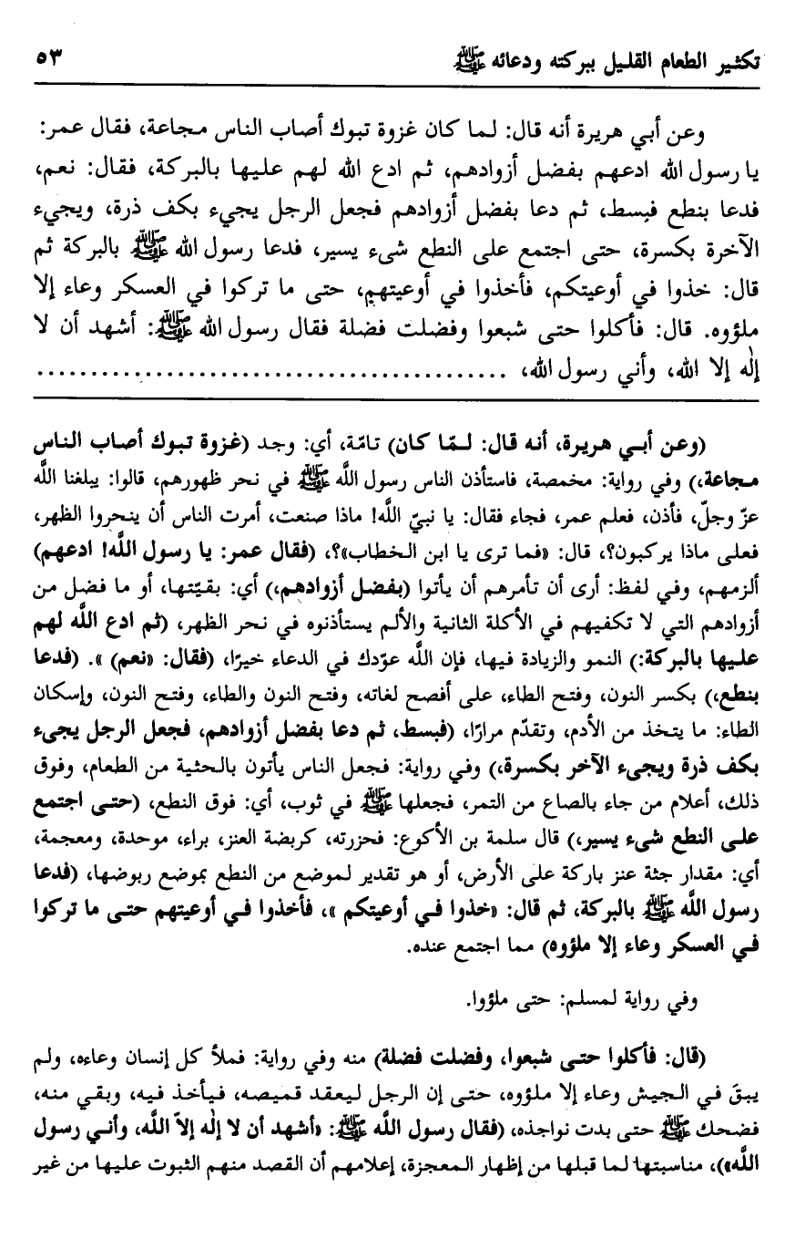 وعن أبي هريرة أنه قال: لما كان غزوة تبوك أصاب الناس مجاعة، فقال عمر: يا رسول الله ادعهم بفضل أزوادهم، ثم ادع الله لهم عليها بالبركة، فقال: نعم، فدعا بنطع فبسط، ثم دعا بفضل أزوادهم فجعل الرجل يجيء بكف ذرة، ويجيء الآخر بكسرة، حتى اجتمع على النطع شيء يسير، فدعا رسول الله صلى الله عليه وسلم بالبركة ثم قال: "خذوا في أوعيتكم"، فأخذوا في أوعيتهم، حتى ما تركوا في العسكر وعاء إلا ملئوه. قال: فأكلوا حتى شبعوا وفضلت فضلة فقال رسول الله صلى الله عليه وسلم: "أشهد أن لا إله إلا الله، وأني رسول الله