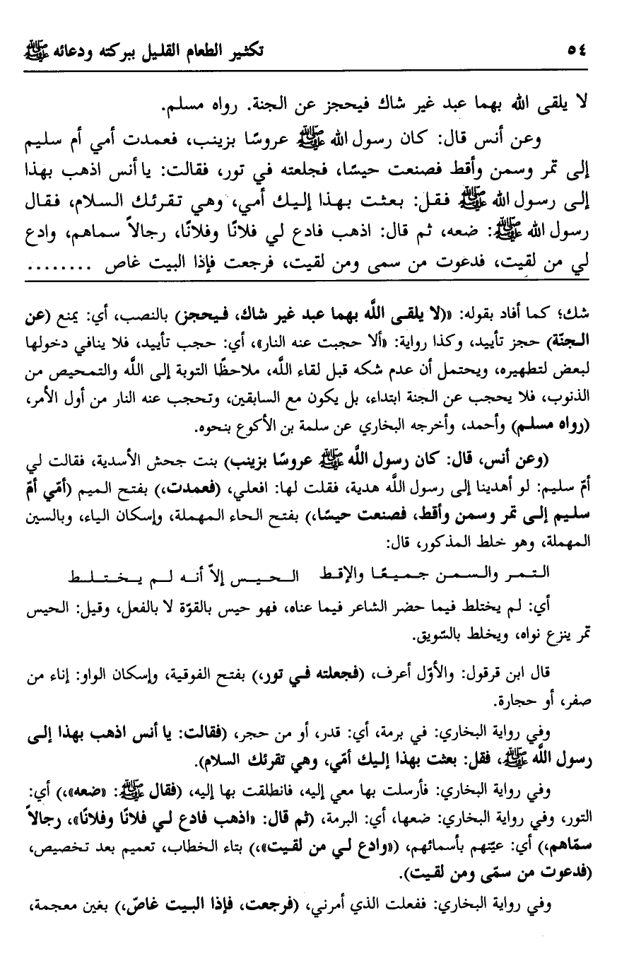 وعن أنس قال: كان رسول الله صلى الله عليه وسلم عروسًا بزينب، فعمدت أمي أم سليم إلى تمر وسمن وأقط فصنعت حيسًا، فجعلته في تور، فقالت: يا أنس اذهب بهذا إلى رسول الله صلى الله عليه وسلم فقل: بعثت بهذا إليك أمي، وهي تقرئك السلام، فقال رسول الله صلى الله عليه وسلم: "ضعه"، ثم قال: "اذهب فادع لي -فلانًا وفلانًا، رجالا سماهم- وادع لي من لقيت"، فدعوت من سمى ومن لقيت، فرجعت فإذا البيت غاص