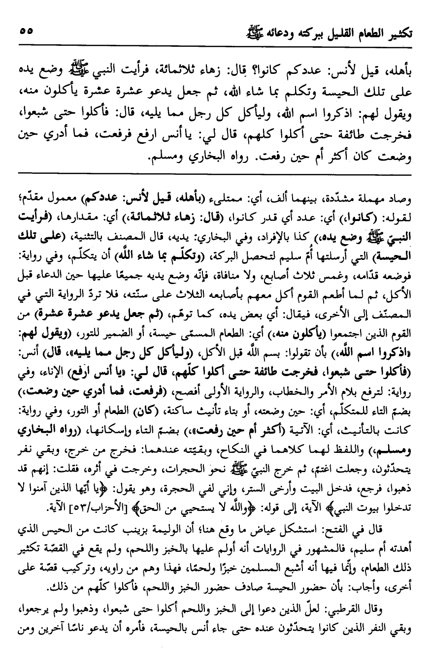 بأهله، قيل لأنس: عددكم كانوا؟ قال: زهاء ثلاثمائة، فرأيت النبي صلى الله عليه وسلم وضع يده على تلك الحيسة وتكلم بما شاء الله، ثم جعل يدعو عشرة عشرة يأكلون منه، ويقول لهم: "اذكروا اسم الله، وليأكل كل رجل مما يليه"، قال: فأكلوا حتى شبعوا، فخرجت طائفة حتى أكلوا كلهم، قال لي: "يا أنس ارفع" فرفعت، فما أدري حين وضعت كان أكثر أم حين رفعت. رواه البخاري ومسلم.