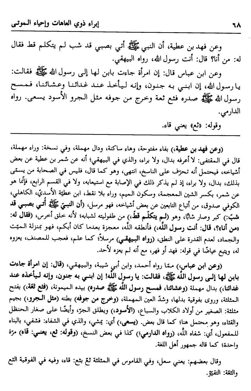 "وعن ابن عباس" مما رواه أحمد، وابن أبي شيبة، والبيهقي، "قال: إن امرأة جاءت بابن لها إلى رسول الله صلى الله عليه وسلم، فقالت: يا رسول الله! إن ابني به جنون، وإنه ليأخذه عند غدائنا" بدال مهملة "وعشائنا، فمسح رسول الله صلى الله عليه وسلم صدره" بيده الميمونة، "فثع ثعة" بفتح المثلثة، وروي بفوقية بدلها، وشد العين المهملة، "وخرج من جوفه" بطنه "مثل الجرو" بجيم مثلثة: الصغير من أولاد الكلاب والسباع، "الأسود" ويطلق الجر، وأيضًا على صغار الحنظل والقثاء، وهو محتمل هنا؛ كما قال بعض. "ويسعى" أي: يمشي، والذي في الشفاء، فشفي، بالبناء للمفعول، أي: شفاه الله، "رواه الدارمي" كذا في بعض النسخ، "وقوله: ثع، يعني: قاء" مرة واحدة؛ كما قاله جمهور أهل اللغة.