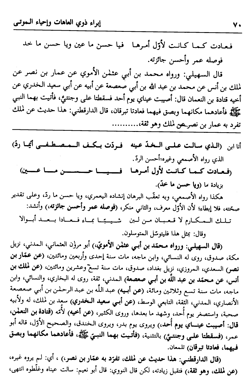 قال السهيلي: ورواه محمد بن أبي عثمان الأموي عن عمار بن نصر عن مالك بن أنس عن محمد بن عبد الله بن أبي صعصعة عن أبيه عن أبي سعيد الخدري عن أخيه قتادة بن النعمان قال: أصيبت عيناي يوم أحد فسقطتا على وجنتي، فأتيت بهما النبي صلى الله عليه وسلم فأعادهما مكانهما وبصق فيهما فعادتا تبرقان، قال الدارقطني: هذا حديث عن مالك تفرد به عمار بن نصر عن مالك وهو ثقة