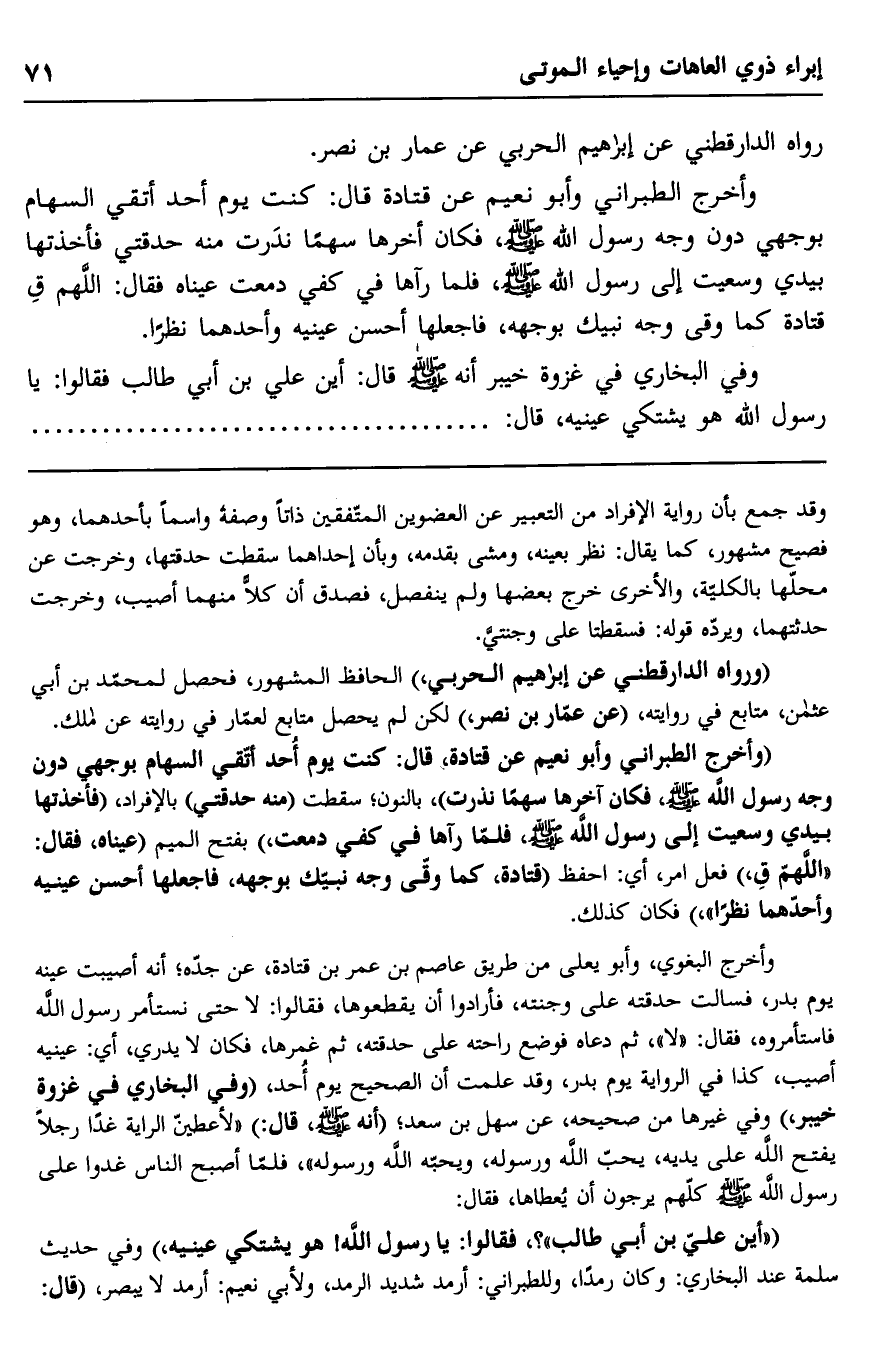 "وأخرج الطبراني وأبو نعيم عن قتادة، قال: كنت يوم أحد أتقي السهام بوجهي دون وجه رسول الله صلى الله عليه وسلم، فكان آخرها سهمًا نذرت" بالنون؛ سقطت "منه حدقتي" بالإفراد، "فأخذتها بيدي وسعيت إلى رسول الله صلى الله عليه وسلم، فلما رآها في كفي دمعت" -بفتح الميم- عيناه، فقال: "اللهم قِ" فعل أمر، أي: احفظ "قتادة، كما وقى وجه نبيك بوجهه، فاجعلها أحسن عينيه وأحدهما نظرًا" فكان كذلك.