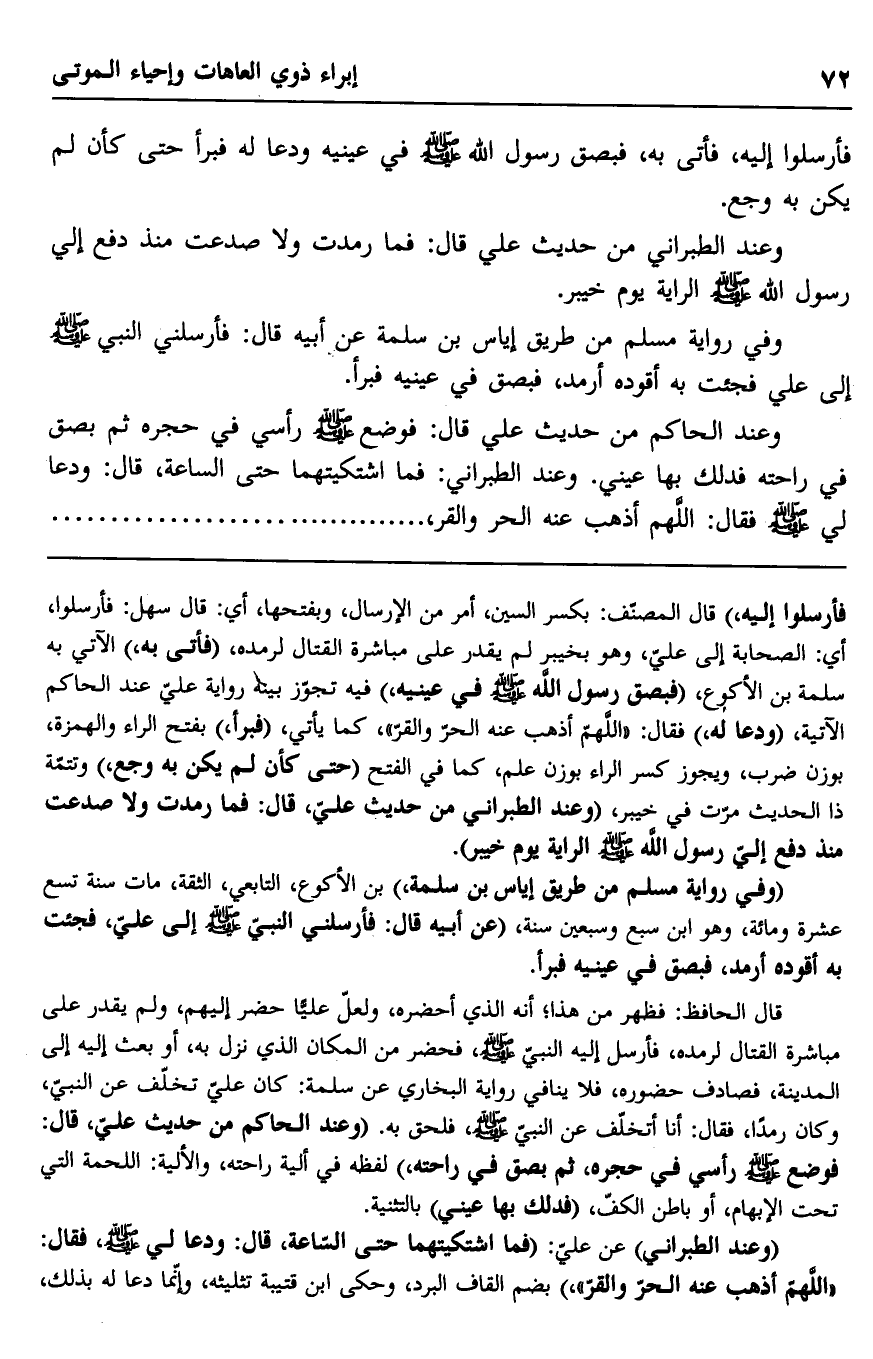 وعند الحاكم من حديث علي قال: فوضع صلى الله عليه وسلم رأسي في حجره ثم بصق في راحته فدلك بها عيني. وعند الطبراني: فما اشتكيتهما حتى الساعة، قال: ودعا لي صلى الله عليه وسلم فقال: "اللهم أذهب عنه الحر والقر