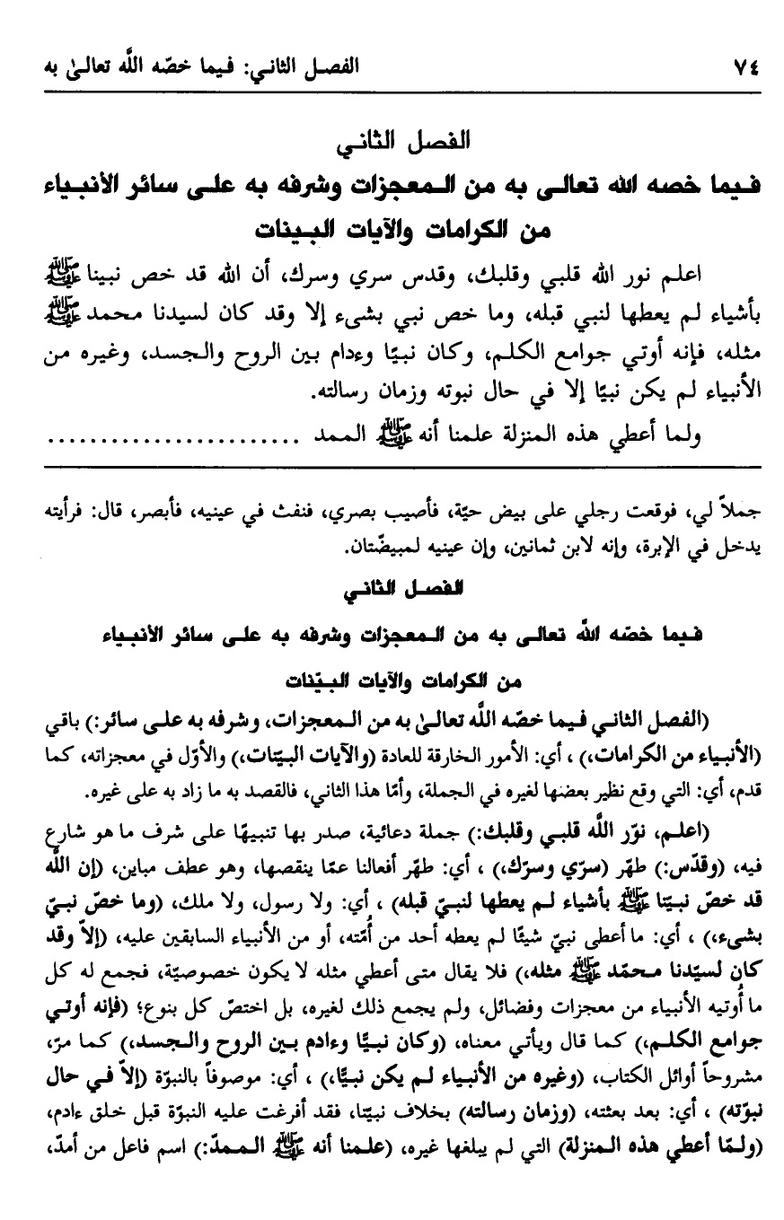 اعلم, نور الله قلبي وقلبك، وقدس سري وسرك، أن الله قد خص نبينا صلى الله عليه وسلم بأشياء لم يعطها لنبي قبله، وما خص نبي بشيء إلا وقد كان لسيدنا محمد صلى الله عليه وسلم مثله، فإنه أوتي جوامع الكلم، وكان نبيًا ودام بين الروح والجسد، وغيره من الأنبياء لم يكن نبيًا إلا في حال نبوته وزمان رسالته.