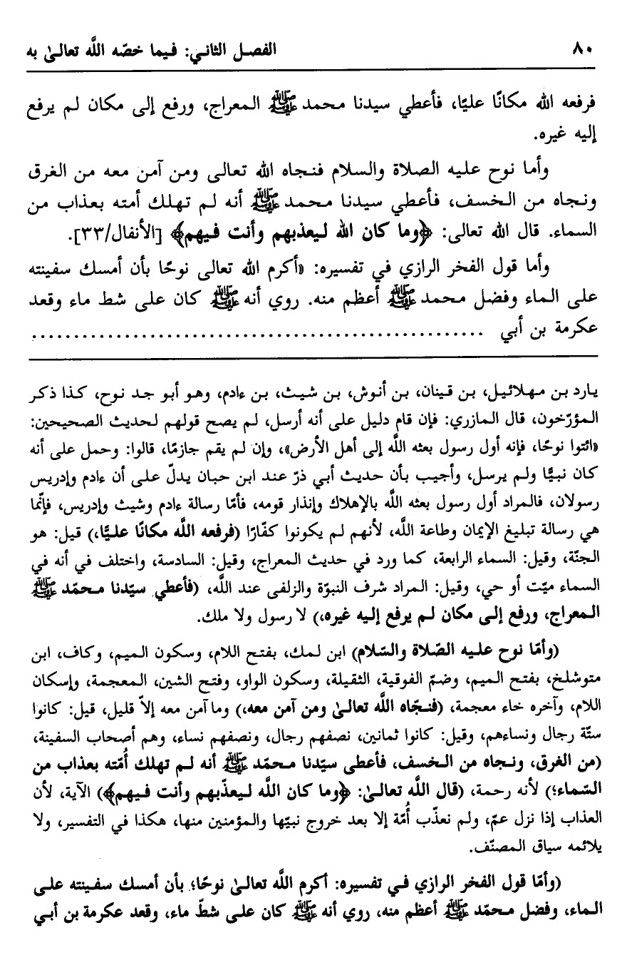 "وأما قول الفخر الرازي في تفسيره: أكرم الله تعالى نوحًا؛ بأن أمسك سفينته على الماء، وفضل محمد صلى الله عليه وسلم أعظم منه، روي أنه صلى الله عليه وسلم كان على شط ماء، وقعد عكرمة بن أبي